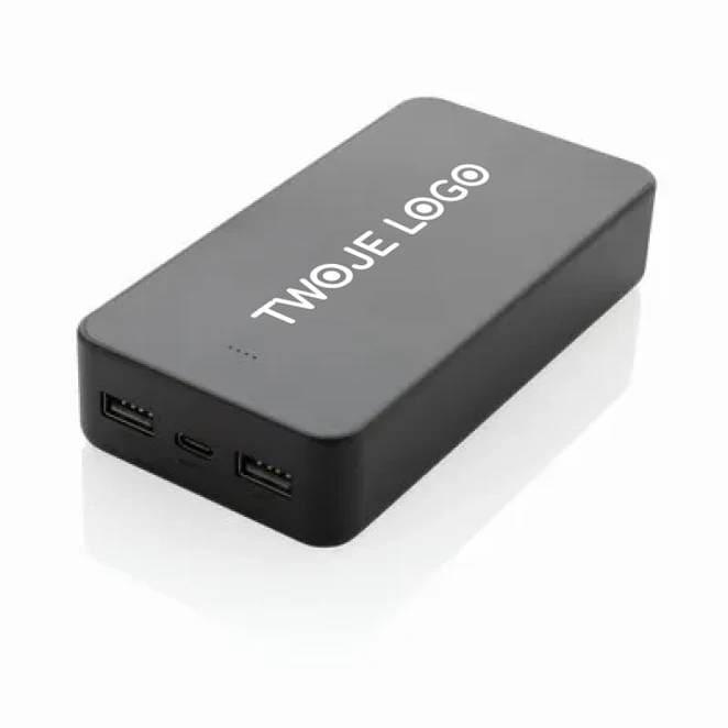 Power bank o pojemności 20000 mAh z portem wejścia/wyjścia USB typu C i dodatkowymi 2 portami USB typu A, możliwość ładowania trzech urządzenia jednocześnie, obudowa wykonana jest z tworzywa ABS pochodzącego z recyklingu z certyfikatem RCS. RCS (Recycled Claim Standard) to standard weryfikacji zawartości surowców wtórnych w produkcie w całym łańcuchu dostaw, wskaźniki zasilania wskazują pozostały poziom energii, wejście typu C 5 V/2,4 A; USB A: wyjście 5 V/2,4 A, wyjście typu C: 5 V/2 A produkt i akcesoria nie zawierają PVC, w zestawie kabel ładujący TPE z recyklingu z certyfikatem RCS, zapakowane w opakowanie FSC® mix
