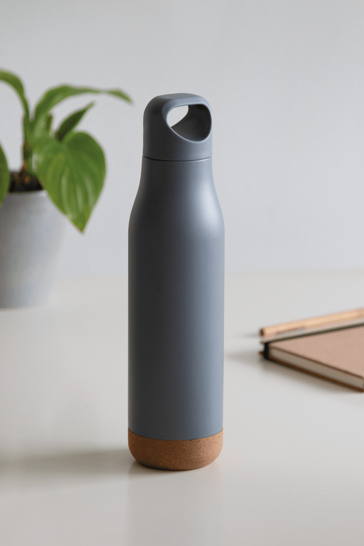 Próżniowa butelka do picia CORKY LEGEND dwuścienna: na zewnątrz i wewnątrz wykonana ze stali nierdzewnej. Plastikowa zakrętka ze szczelnym gwintem, korkowe denko, pojemność: ok. 500 ml, utrzymuje ciepło napoju przez ok. 12 godzin i zimno do 24 godzin.