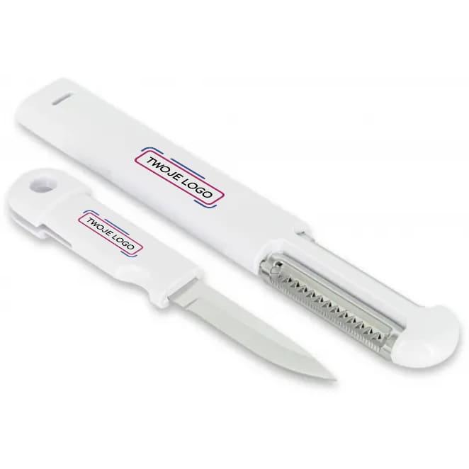 Plastikowe narzędzie kuchenne 3 w 1 w kolorze białym składające się z noża, obieraczki i tarki. Dostępne w białym kolorze.