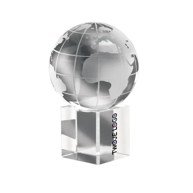 Kryształowy przycisk do papieru: kula ziemska na kryształowej podstawce. Pakowane w klasyczne ozdobne pudełko.