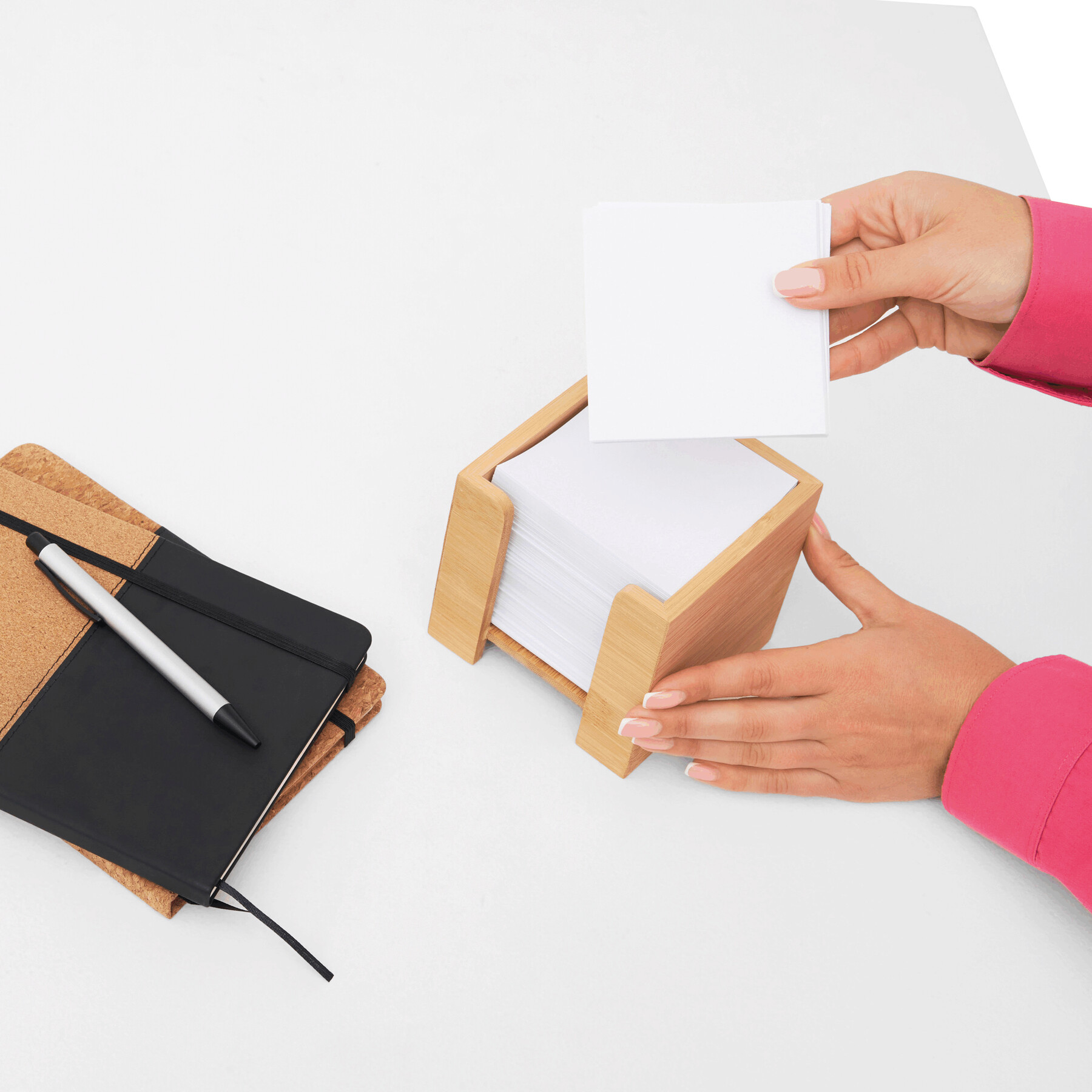 Pudełko na karteczki NEVER FORGET BAMBOO: bambusowe pudełko z dużym otworem i 900 białymi, bezdrzewnymi karteczkami na notatki (70 g/m²).