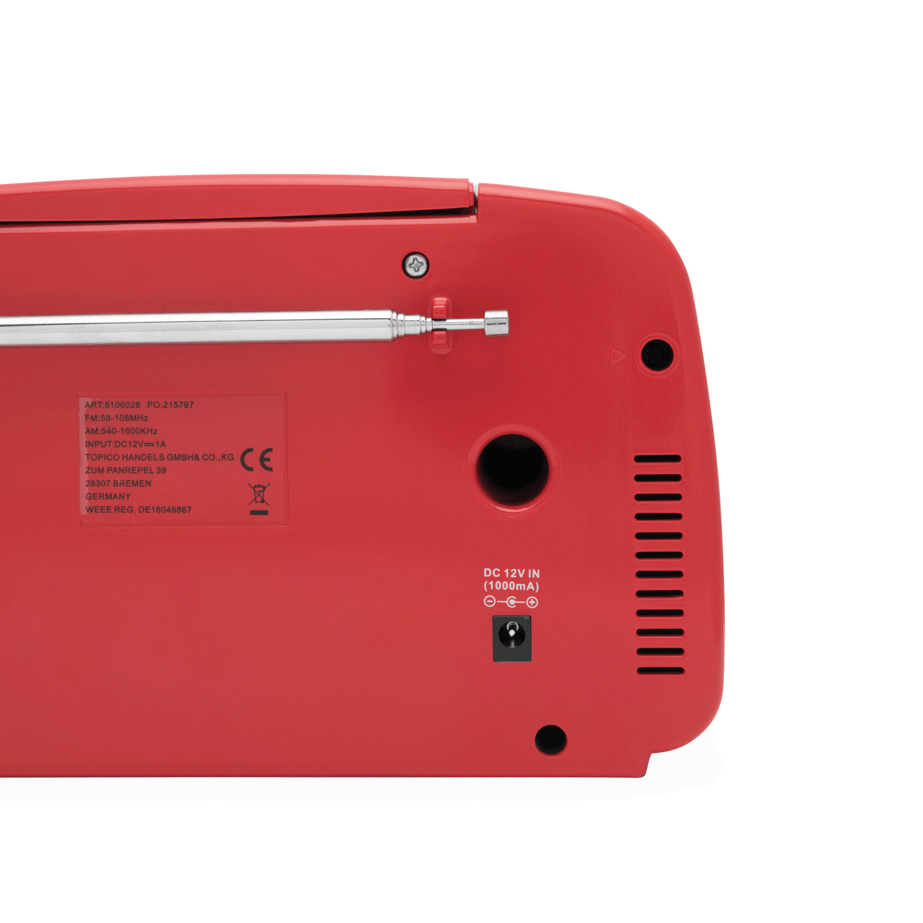 Rejestrator radiowy bezprzewodowy CD DINER. Radio AM/FM, odtwarzacz CD, funkcja AUX-IN. Pliki MP3 mogą być odtwarzane przez złącze USB lub z CD. Gniazdo audio, podświetlany wyświetlacz, wtyczka zasilania 12 V, 2 pokrętła sterujące głośnością i "następny/poprzedni album" (w trybie MP3). Posiada pilot zdalnego sterowania na podczerwień. Z instrukcją obsługi.