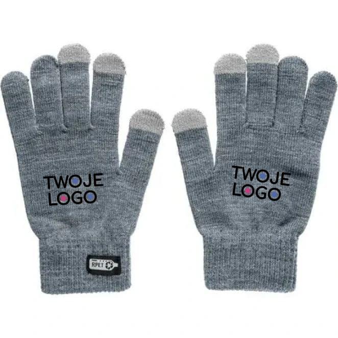 Rękawiczki z 3 specjalnymi końcówkami umożliwiającymi obsługę ekranów dotykowych, etykieta RPET z zewnątrz, etykieta informująca o praniu wewnątrz, produkt wykonany z RPET i elastanu