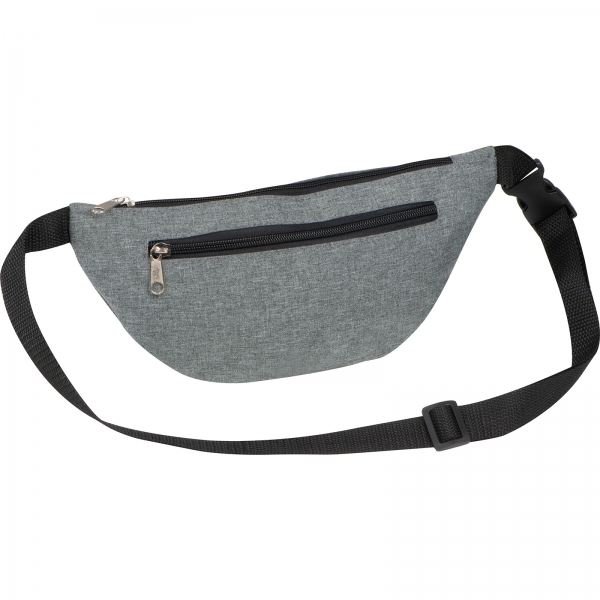 Saszetka nerka na pasku, wykonana z poliestru. Posiada przegrodę główną i dodatkową kieszonkę z przodu - obydwie zamykane na zamek.