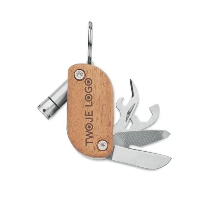 Scyzoryk wielofunkcyjny ze stali nierdzewnej z rękojeścią z drewna akacjowego. 9 funkcji, w tym 1 dioda LED. W zestawie 3 baterie guzikowe.