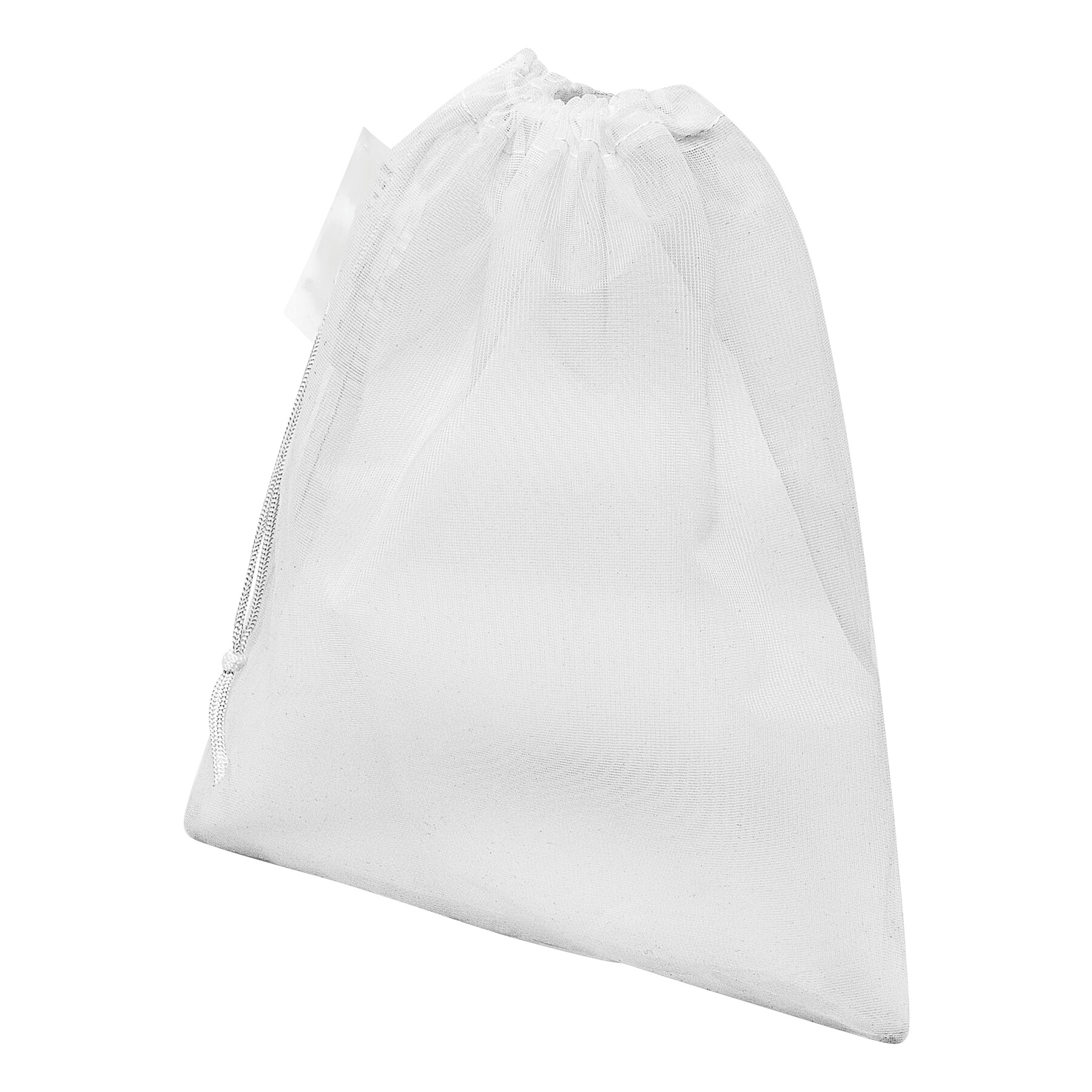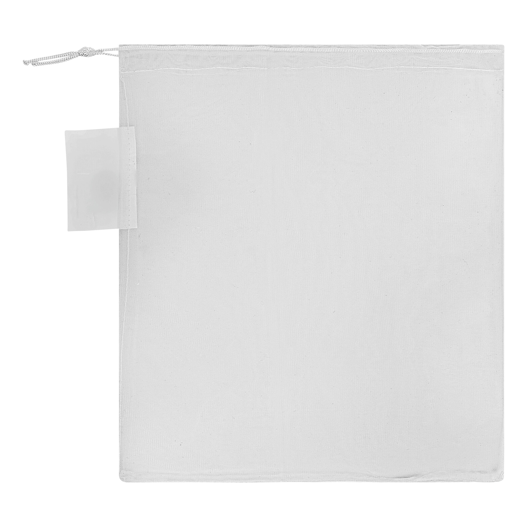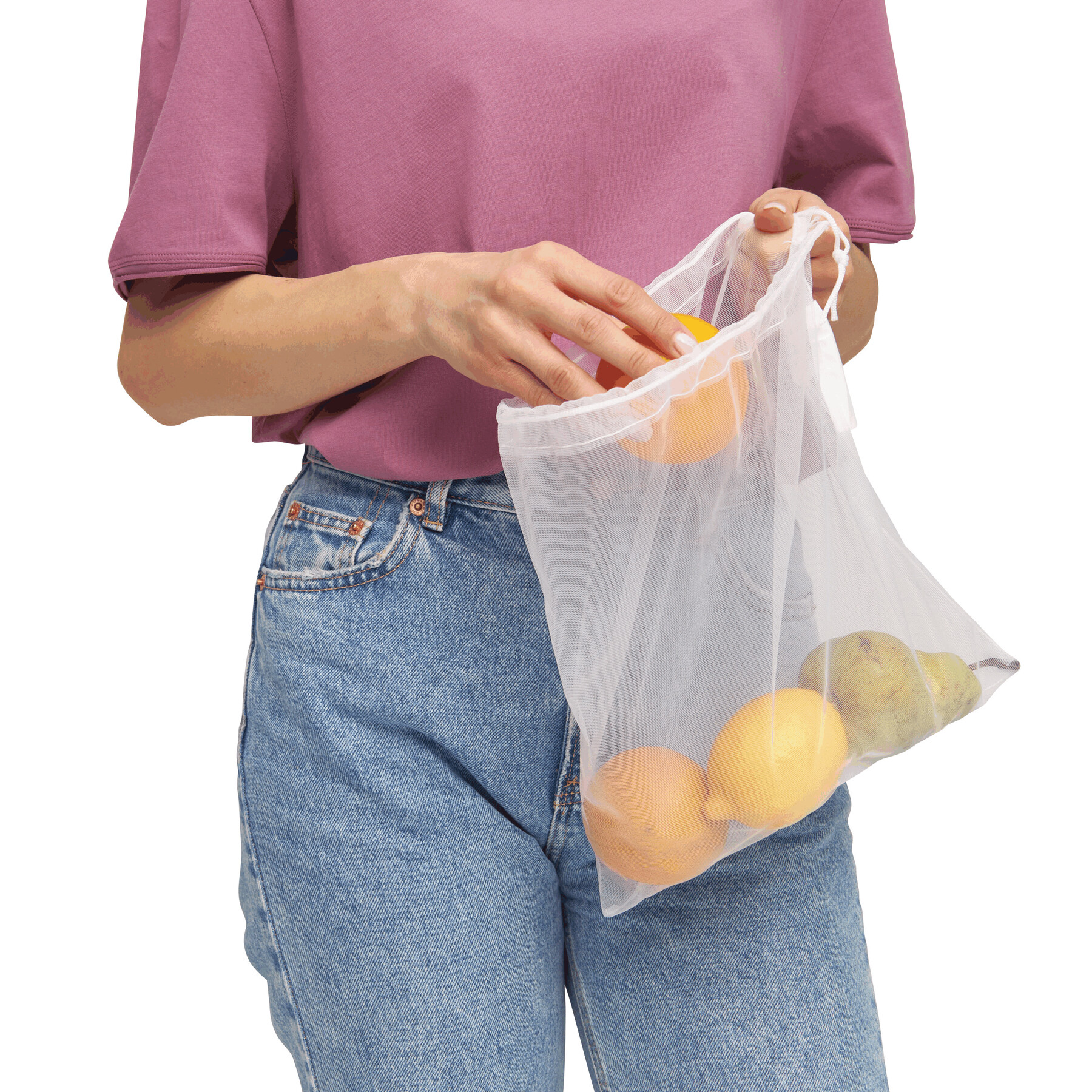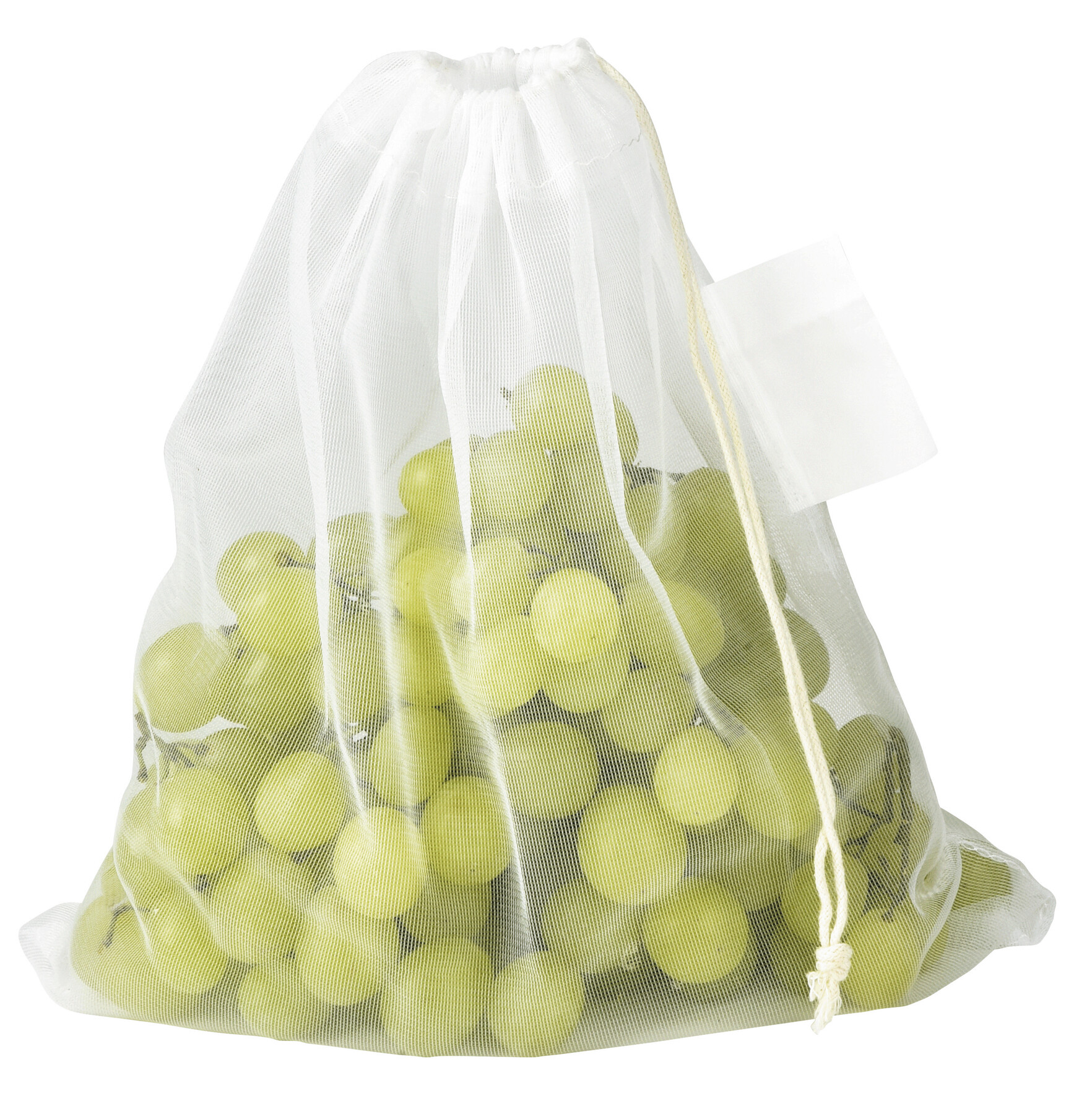 Siatka na owoce i warzywa BLUE PLANET z materiałów pochodzących z recyklingu, zamykana ściągaczem, do prania, wielokrotnego użytku, z metką do druku.