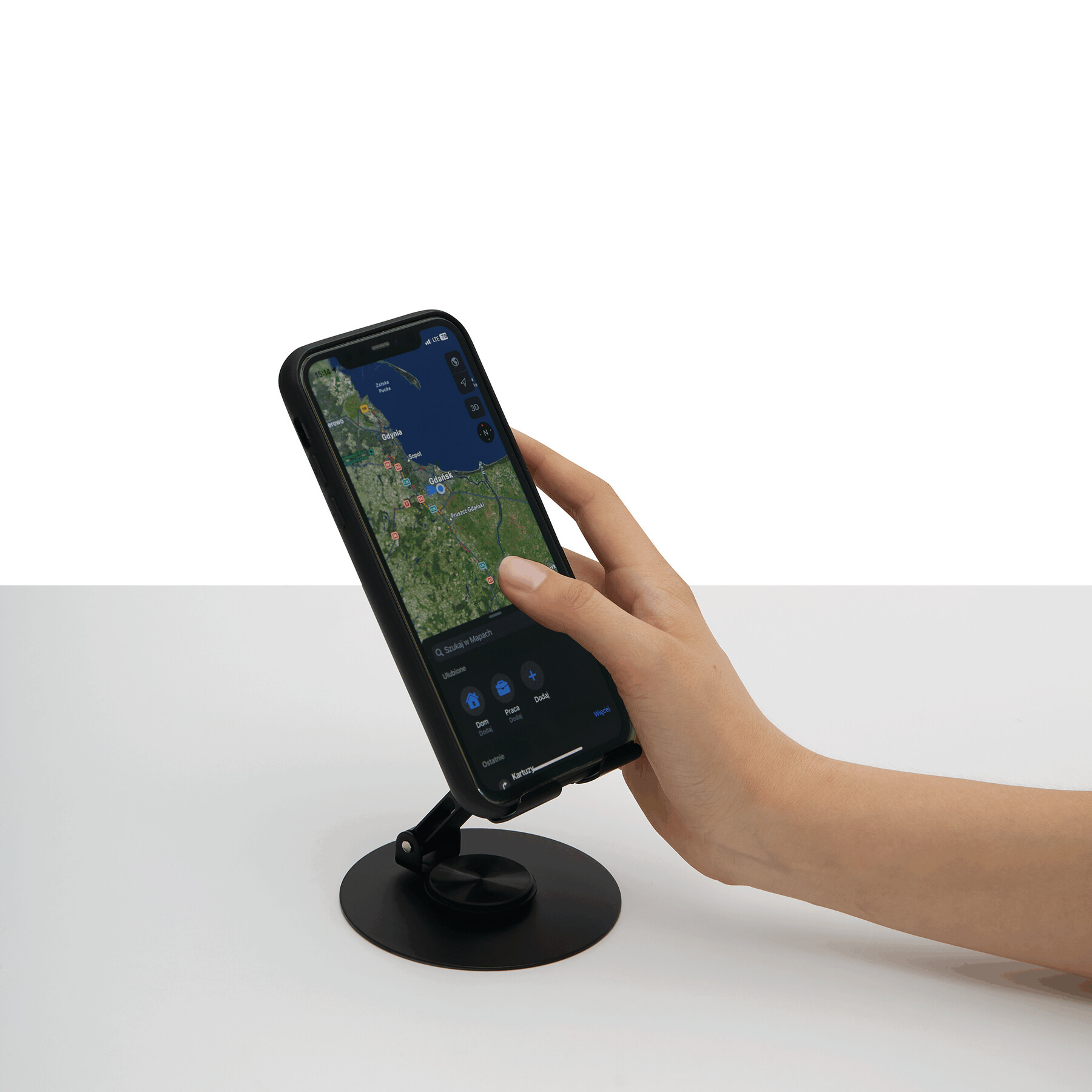 Składany uchwyt na telefon DESK MASTER. Stalowy uchwyt o antypoślizgowej podstawie. Może być obracany o 360° i ma regulowany kąt nachylenia, co zwiększa wygodę użytkowania.