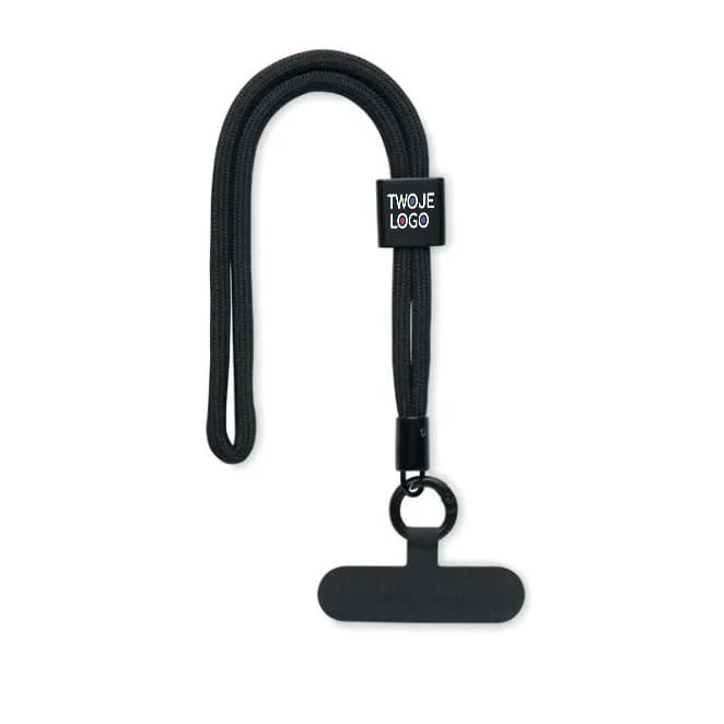 Krótka, regulowana smycz do telefonu wykonana z poliestru RPET. Długość 25 cm.