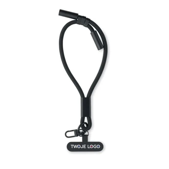 Krótka smycz do telefonu z kablem do ładowania i transmisji danych typu C do typu C o mocy 60 W z RPET z dodatkowym klipsem na klucze.