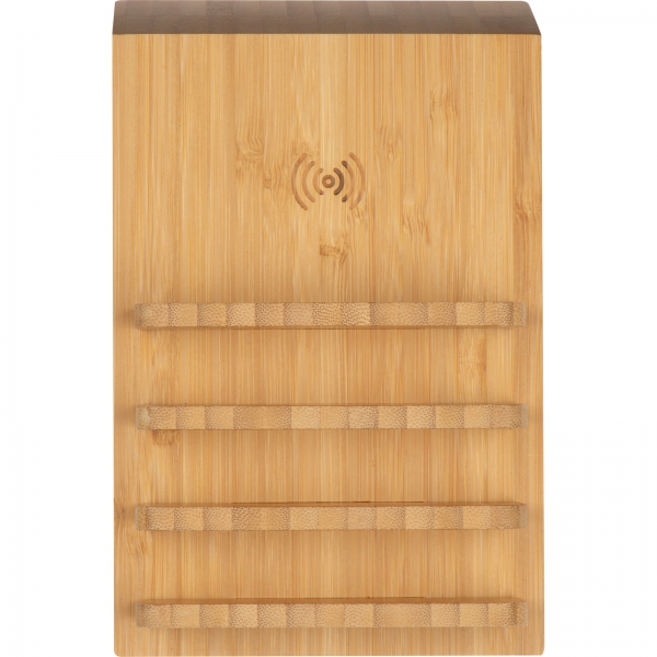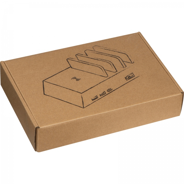 Indukcyjna stacja ładująca z miejscem na 4 urządzenia. Ładowarka wyposażona w 2 porty USB i 1 port typu C. Kabel do ładowania dołączony.