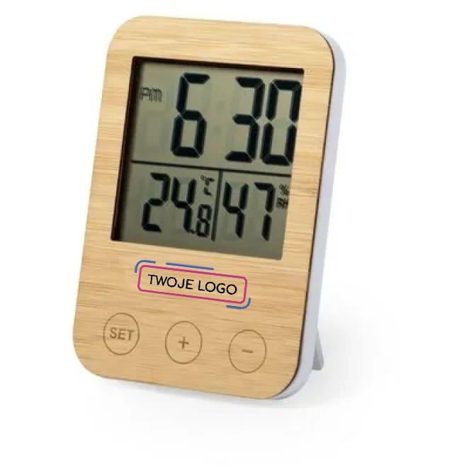 Stacja pogodowa, zegar, temperatura, wilgotność powietrza, bambusowy front