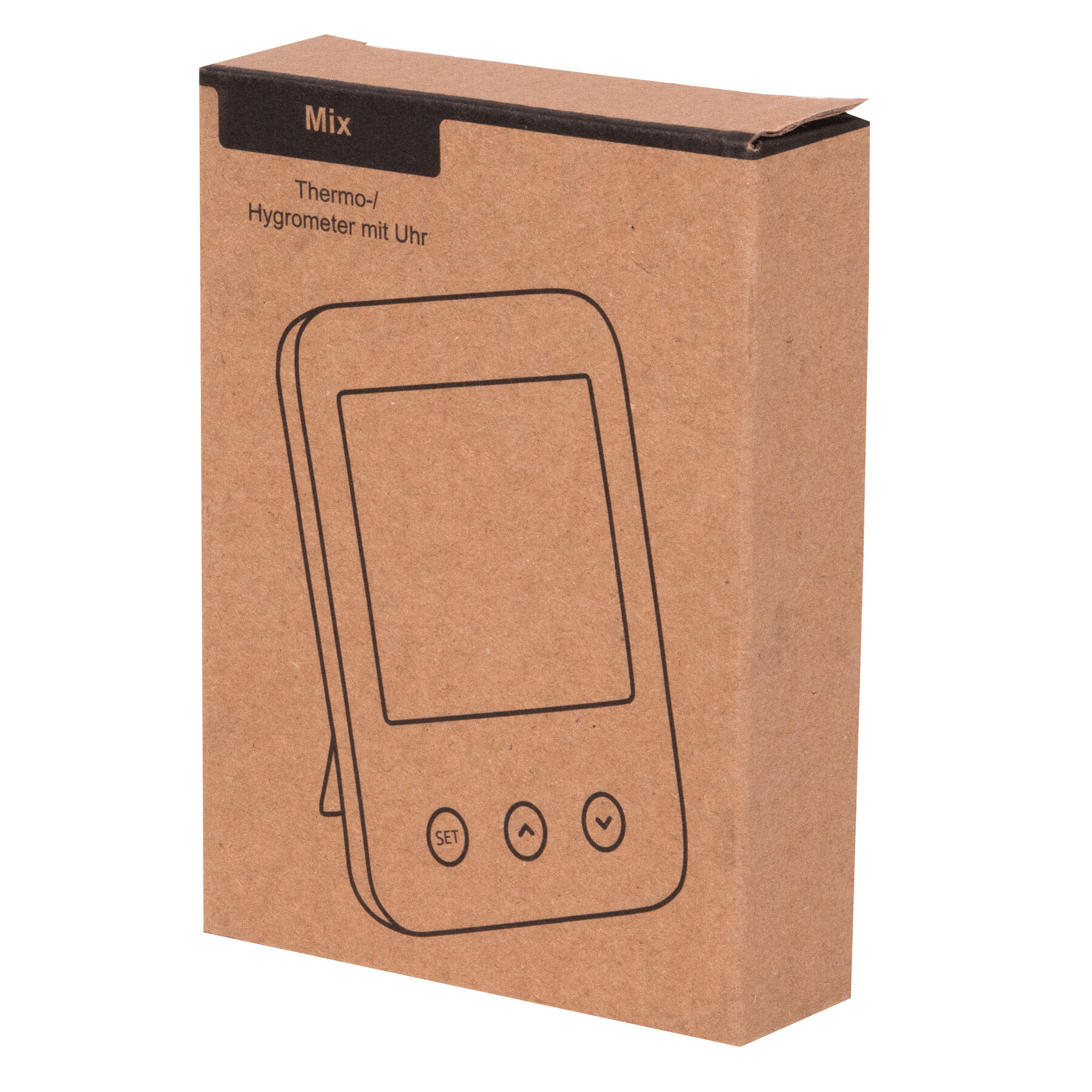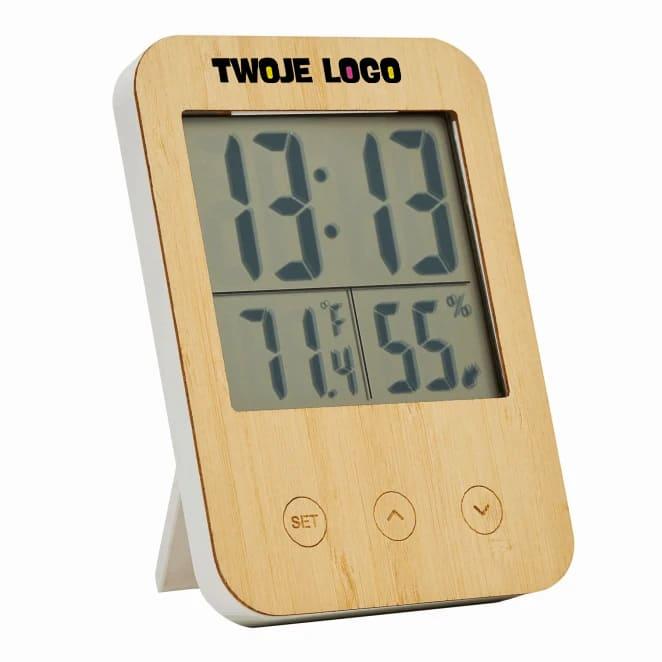 Stacja pogodowa MIX: z bambusowym frontem, funkcją alarmu, wyświetlaczem daty i godziny, higrometrem i termometrem (w °C i °F), rozkładaną podstawką i otworem do montażu na ścianie z tyłu.