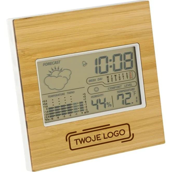 Stacja pogodowa, zegar, kalendarz, budzik z opcją drzemki, temperatura, wilgotność powietrza, informacje o pogodzie, bambusowy front