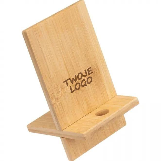 Bambusowa podstawka pod telefon z dziurką na kabel, umożliwiającą podłączenie ładowarki.