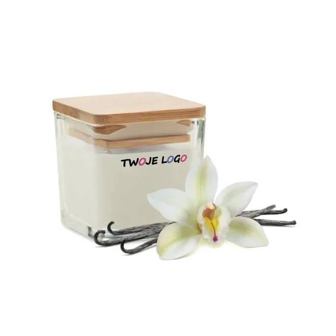 Zapachowa świeca woskowa na bazie roślin w kwadratowym szklanym pojemniku z bambusową pokrywką. 50 gr. Czas palenia: 8 godzin. Biały (06) zapach waniliowy, żółty (08) zapach cytrynowy, pomarańczowy (10) zapach pomarańczowy, zielony (48) zapach jabłkowy.