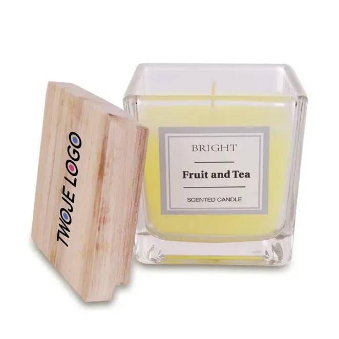 Świeczka z drewnianą przykrywką Alcamo z nadrukiem na zamówienie