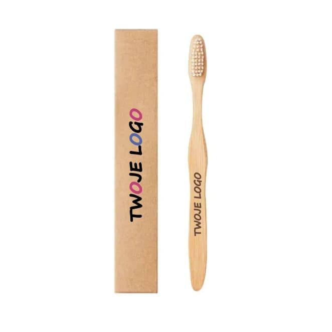 Bambusowa szczoteczka do zębów. Zapakowana w brązowe tekturowe pudełko.