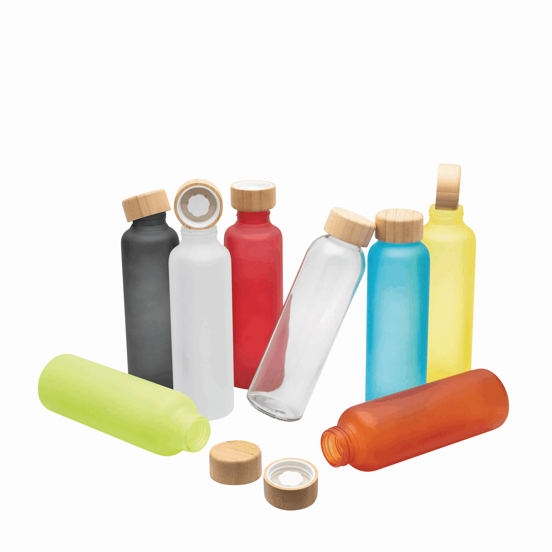 Szklana butelka TAKE FROSTY z bambusową zakrętką. Pojemność ok. 500 ml.