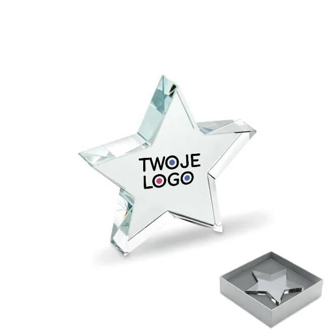 Szklana statuetka gwiazda w pudełku upominkowym.