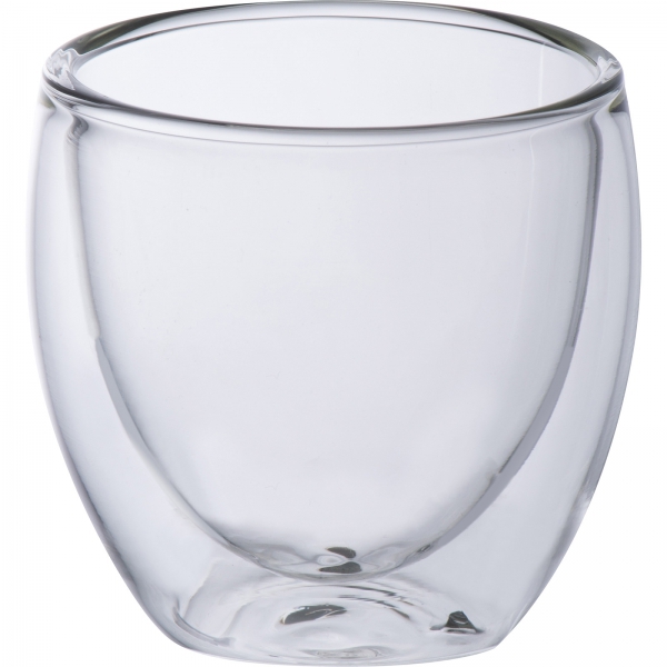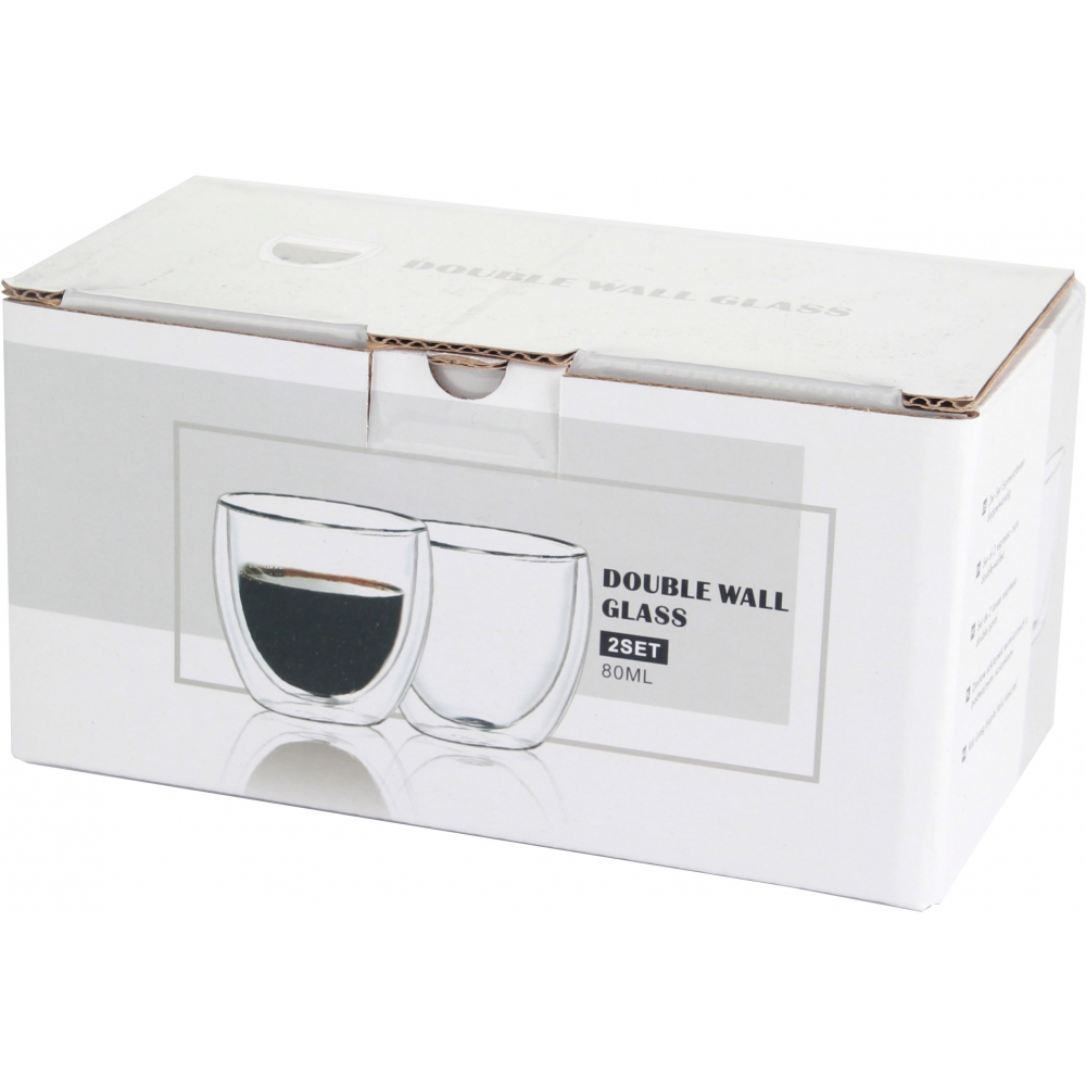 Dwie szklane filiżanki do espresso z podwójnymi ściankami, każda o pojemności 80 ml.