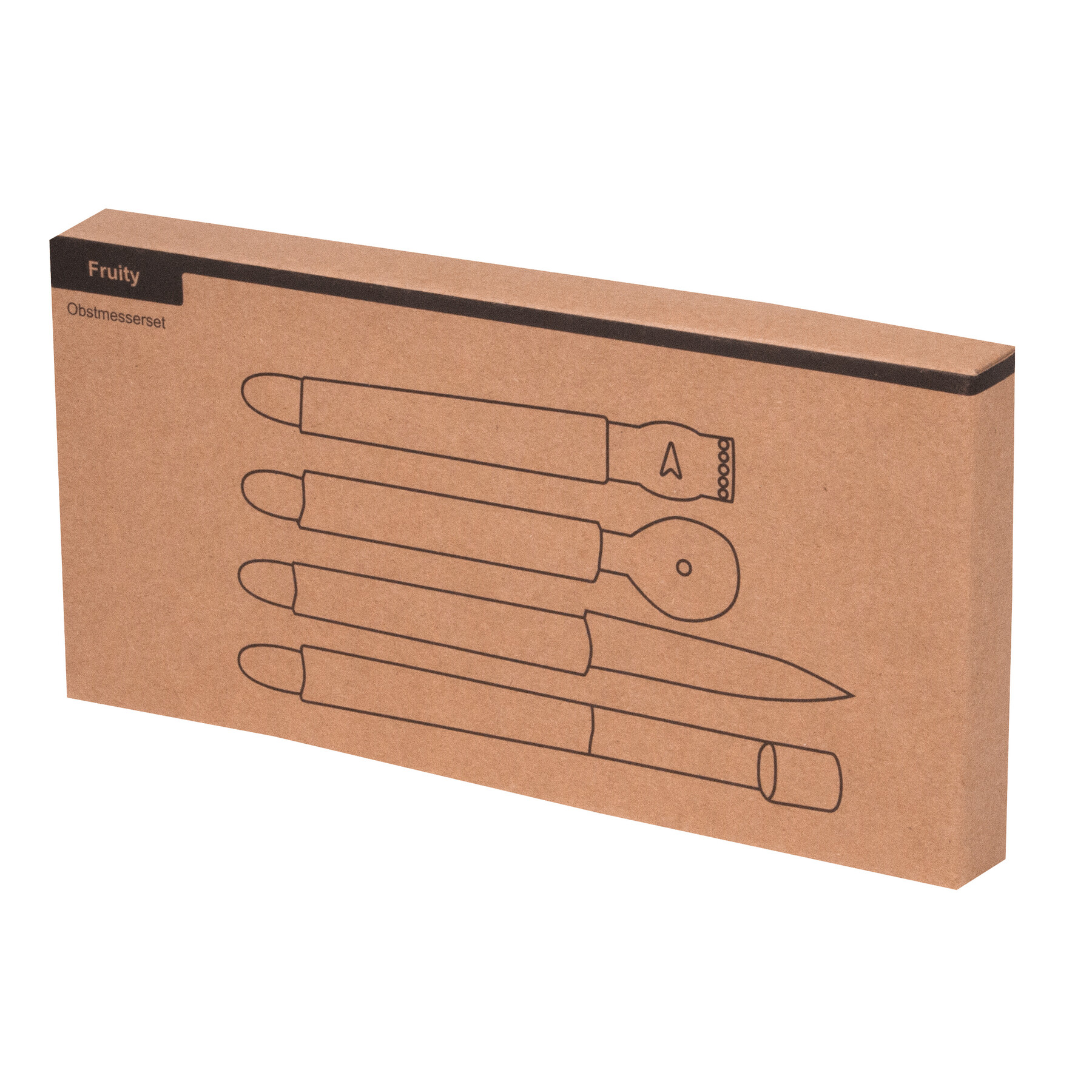 Sztućce do owoców FRUITY z nożem do pomarańczy, tarką do cytryn, łyżką do oczyszczania z pestek, narzędziem do wyjmowania nasion i łusek z jabłek. Wszystkie sztućce mają praktyczne zawieszki, zestaw pakowany w pudełko.