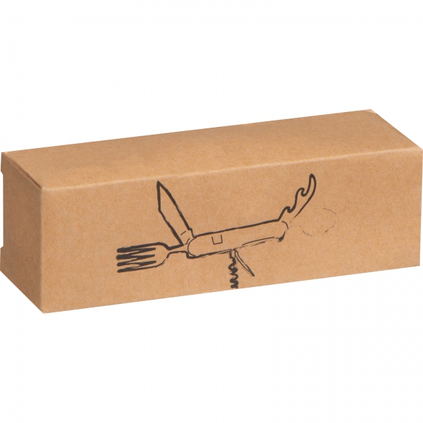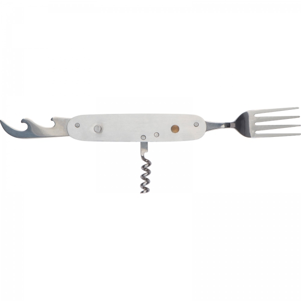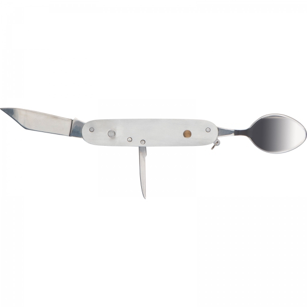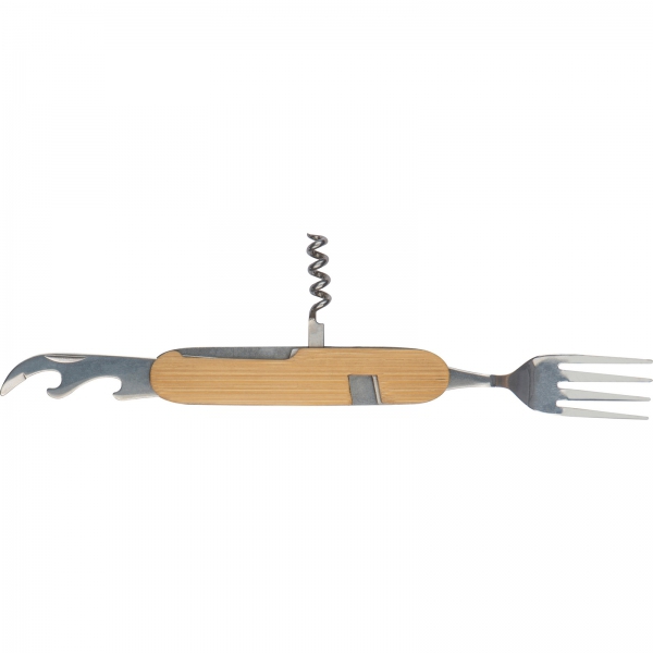 Sztućce kempingowe, wykonane ze stali nierdzewnej w obudowie z drewna bambusowego. Narzędzie wyposażone w łyżkę, nóż, otwieracz do butelek, nożyk do folii, korkociąg oraz widelec.
