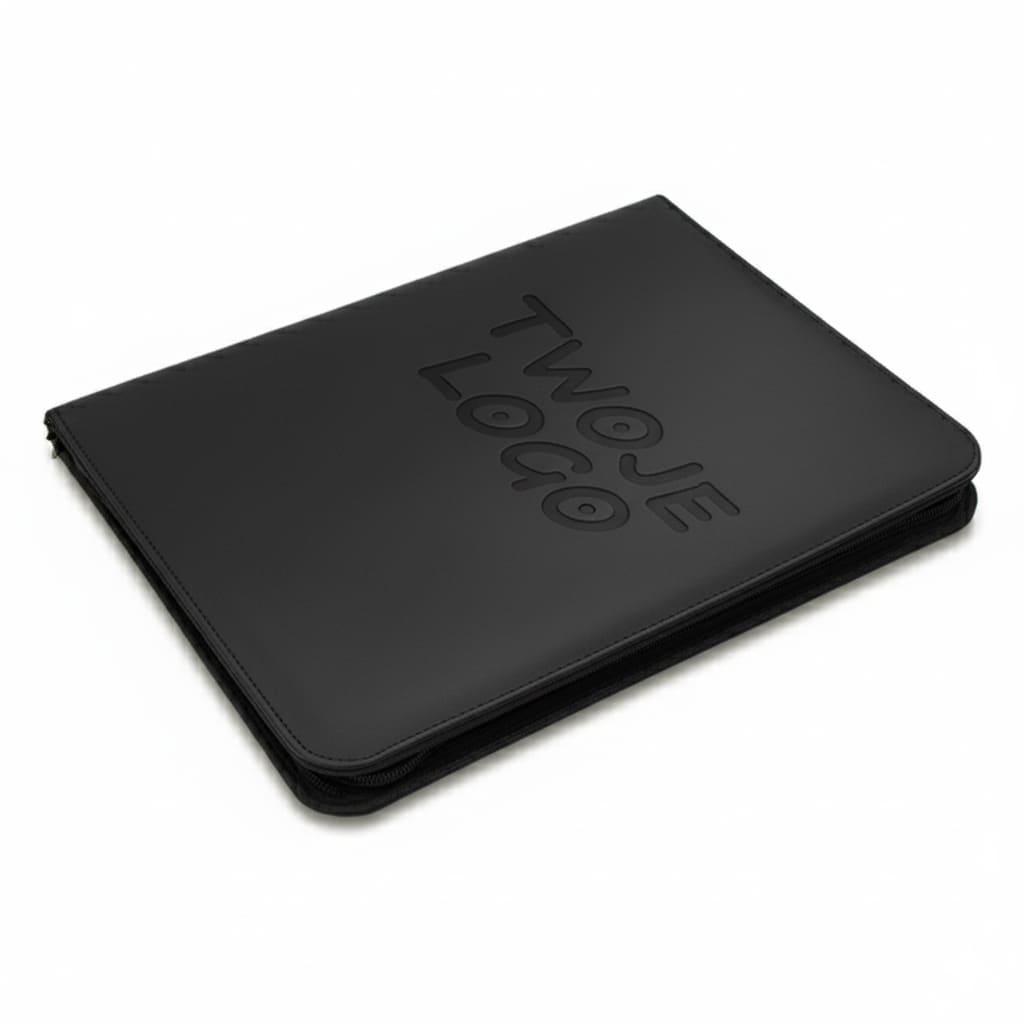 Elegancka teczka A4 wykonana z ekoskóry, zamykana na zamek. Zawiera notes, dwie małe kieszonki, elastyczny uchwyt na telefon oraz składany stojak do telefonu. Teczka posiada również miejsce na długopis.