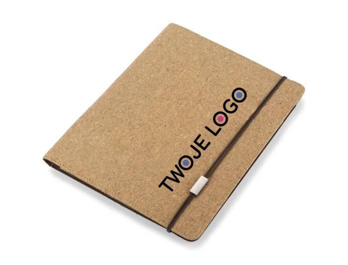Korkowa teczka A4 z notatnikiem. Zawiera dużą kieszeń do przechowywania dokumentów, dwie mniejsze kieszonki oraz miejsce na długopis. Zamykana za pomocą gumki z metalowym elementem. Zapakowana w woreczek non woven.