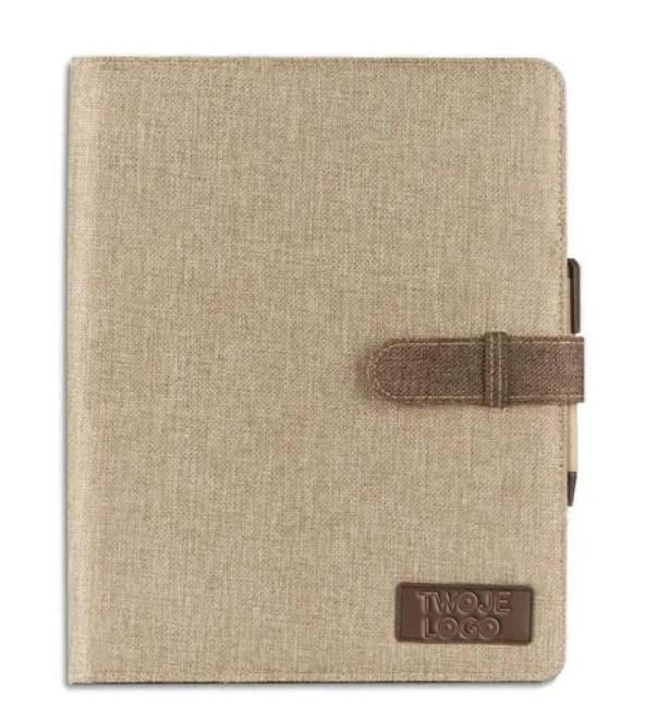 Teczka ekologiczna wykonana z lnu. Zawiera 2 duże kieszenie, 2 miejsca na USB, małe kieszonki, długopis, notes. Notes nie jest umocowany na stałe, ale wsuwany w kieszonkę, dzięki czemu można go łatwo wymienić. Logo wygrawerujemy na ekoskórce umieszczonej na okładce.