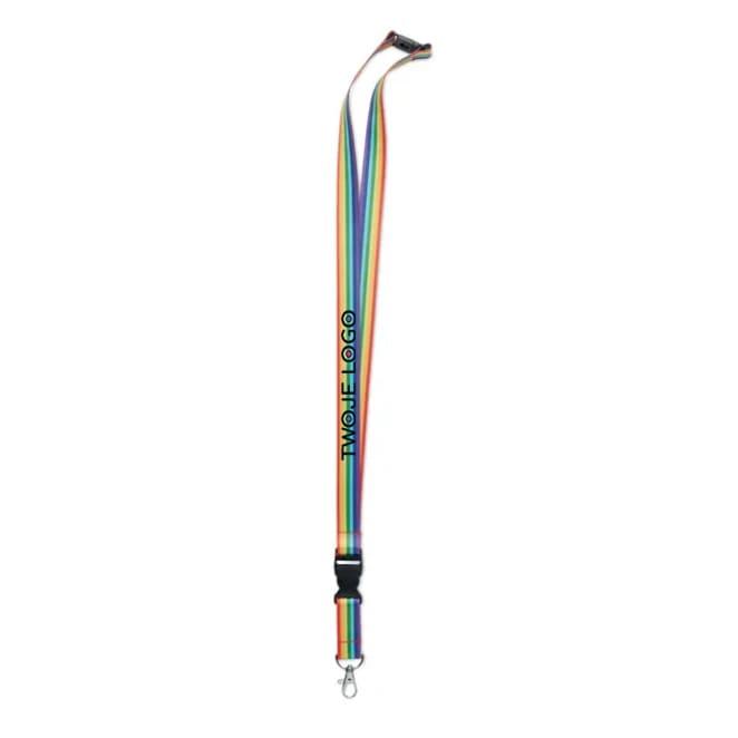 Tęczowa smycz RPET z metalowym karabińczykiem, odpinaną klamrą i karabińczykiem. Wesoła i kolorowa smycz, do której można przypiąć klucze, identyfikatory, przepustki lub inne akcesoria. Ta smycz na pewno przyciągnie uwagę.