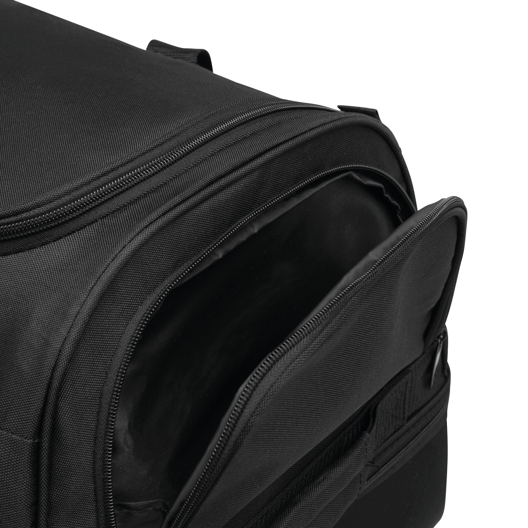 Torba podróżna na kółkach BERGEN. 2 uchwyty do przenoszenia z paskiem wzmacniającym na rzep, 1 kieszeń przednia na zamek, 2 osobne przedziały na zamek, 1 kieszeń na zamek z boku, wyściełany uchwyt do przenoszenia, wysuwana rączka do ciągnięcia torby, lekko jeżdżące kółka z ochraniaczami rogów, od spodu 2 płozy i stopki do podparcia o podłoże.