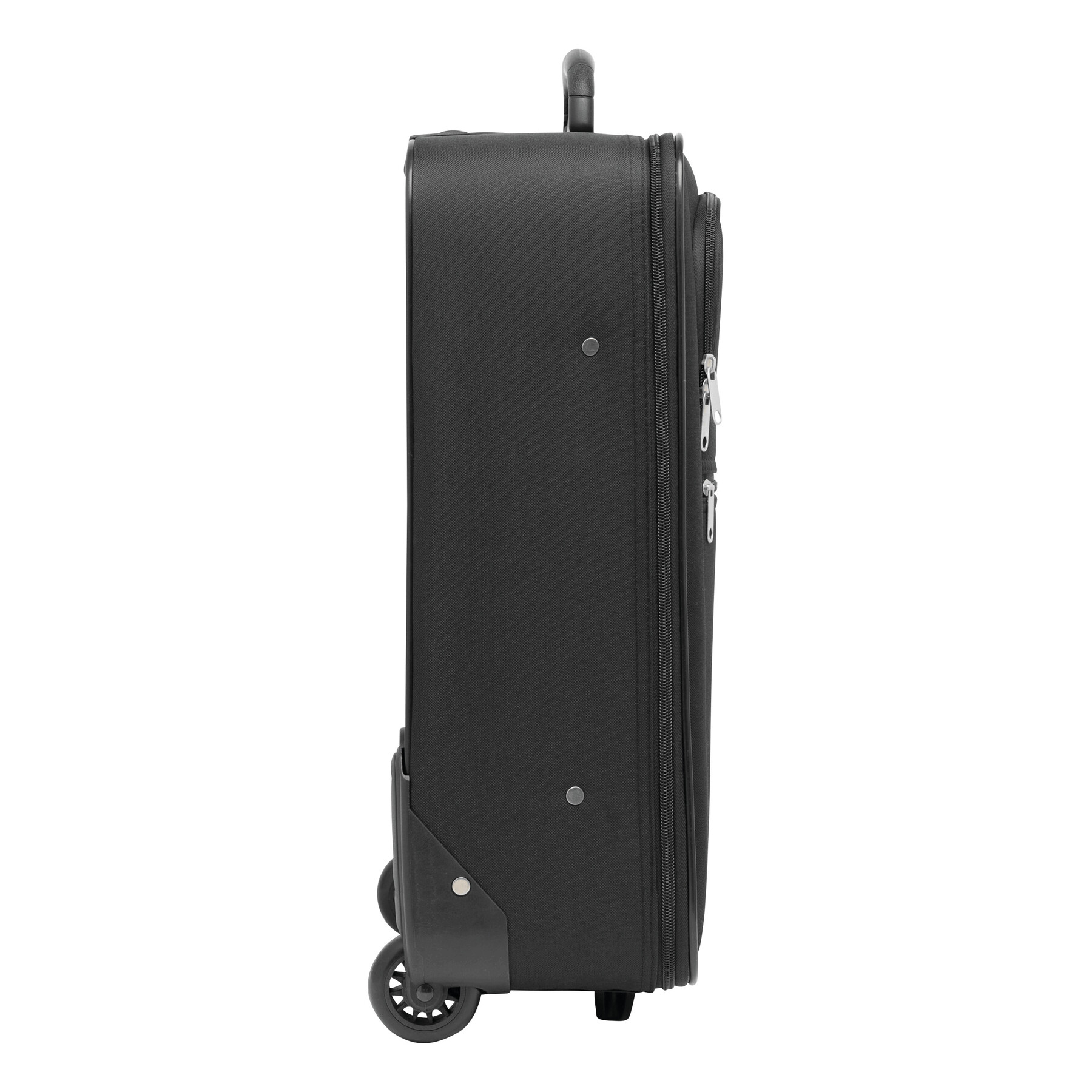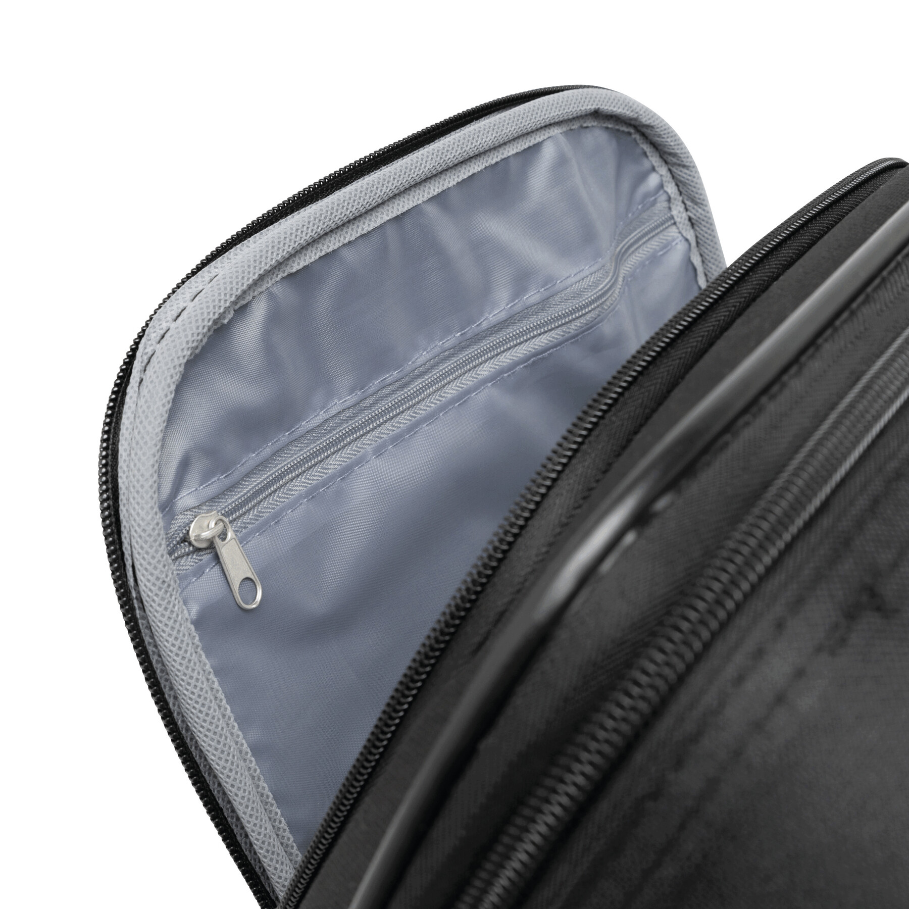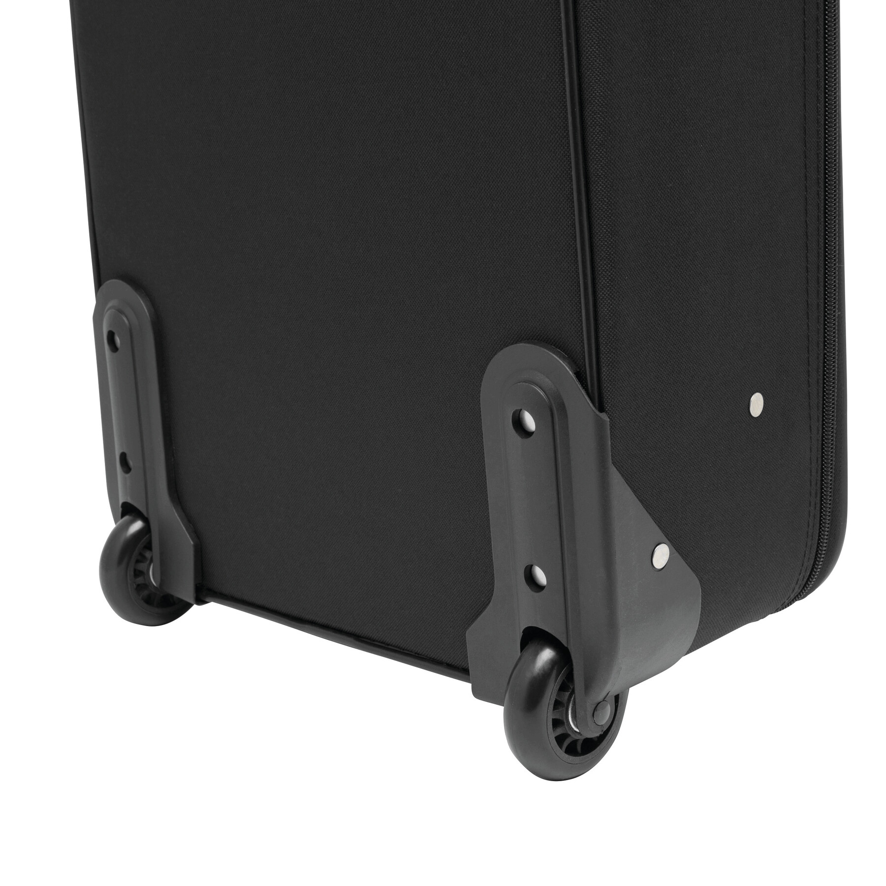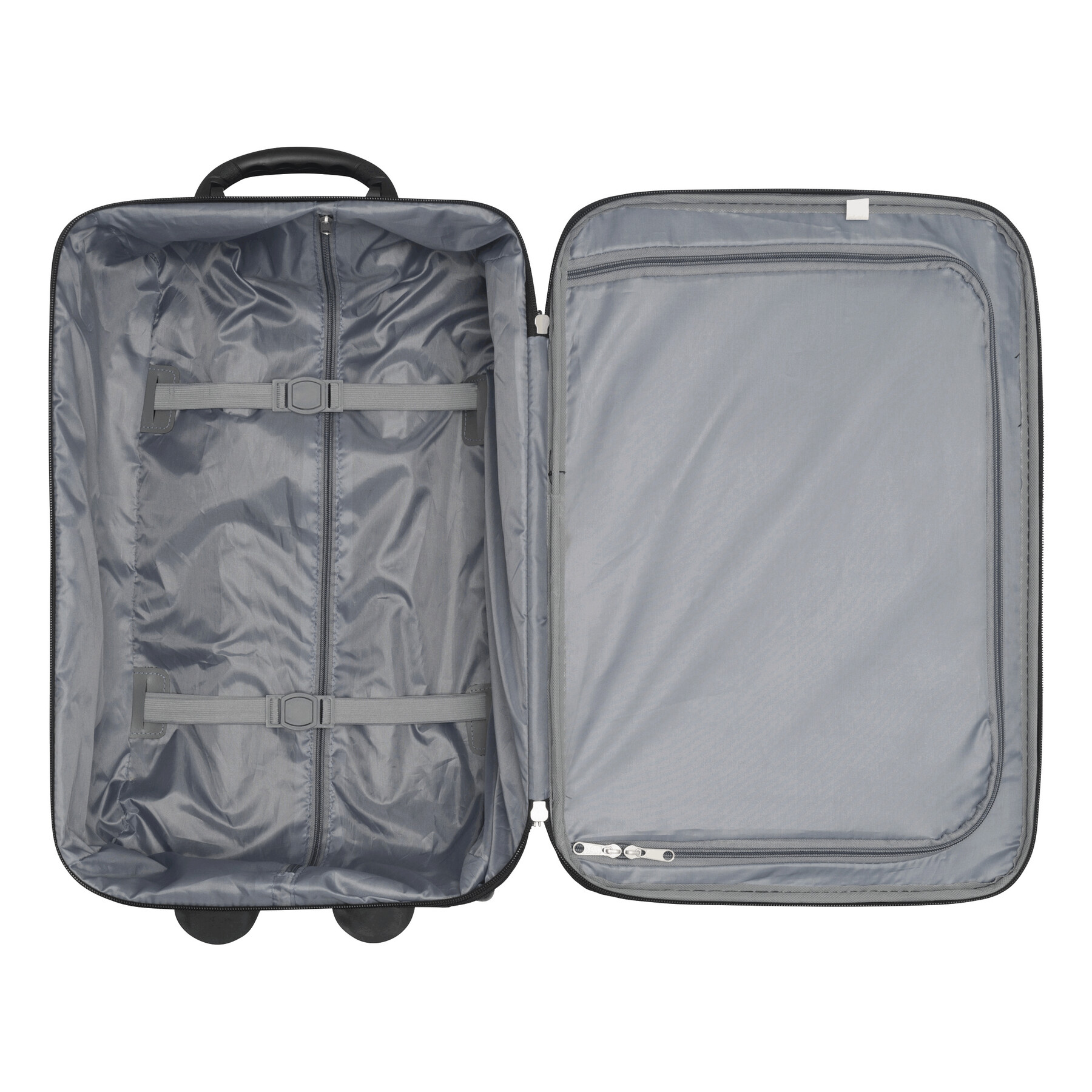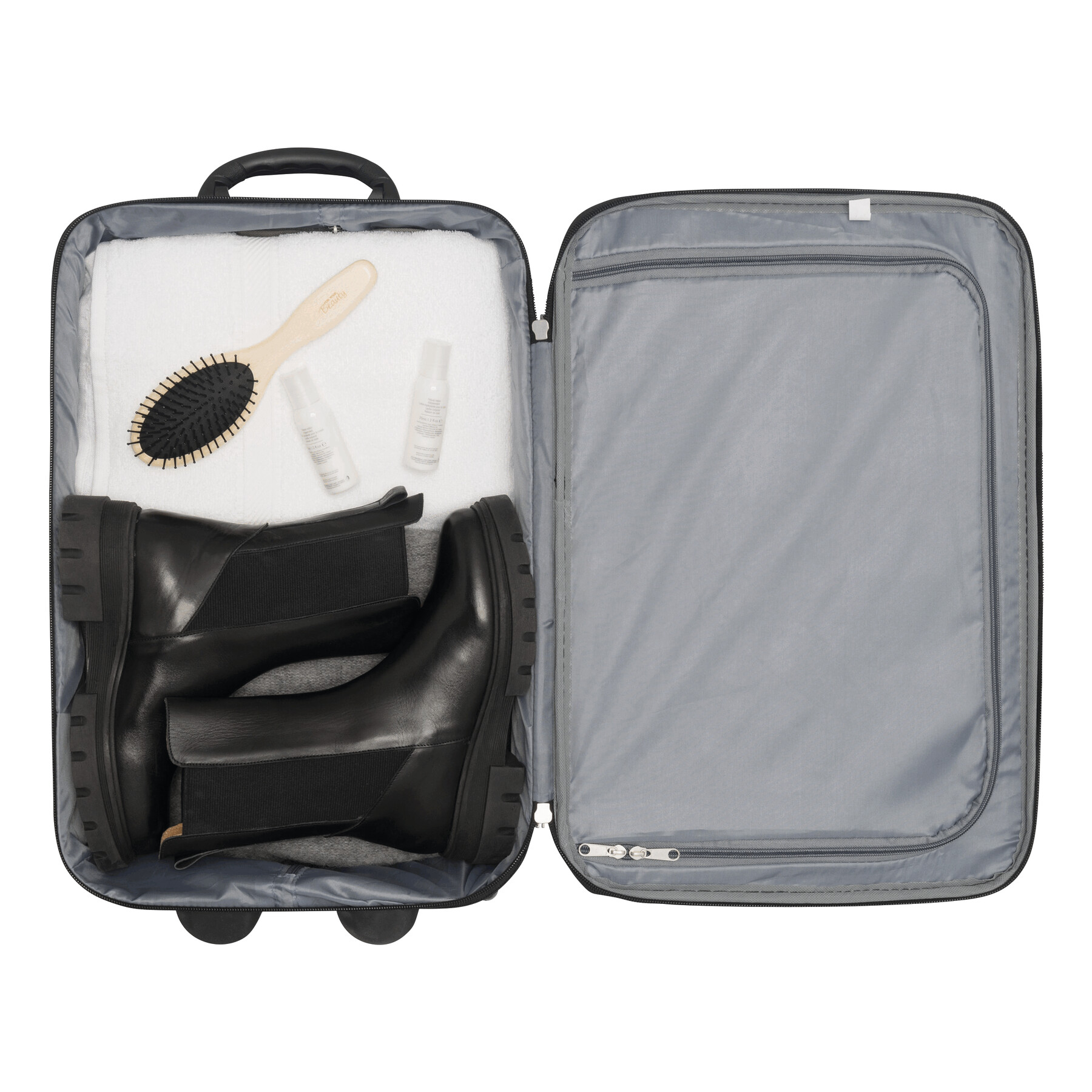 Torba podróżna na kółkach DUBLIN z wyściełanym wnętrzem, kieszenią zamykaną na zamek i paskiem do unieruchamiania zawartości. 2 zewnętrzne kieszenie zamykane na zamek, regulowany i składany uchwyt do ciągnięcia, rączki do przenoszenia, łatwo toczące się kółka, zamek szyfrowy, etykietka adresowa z tyłu. Metalowa, zdejmowalna płytka do grawerowania. Wielkość odpowiednia do samolotu.