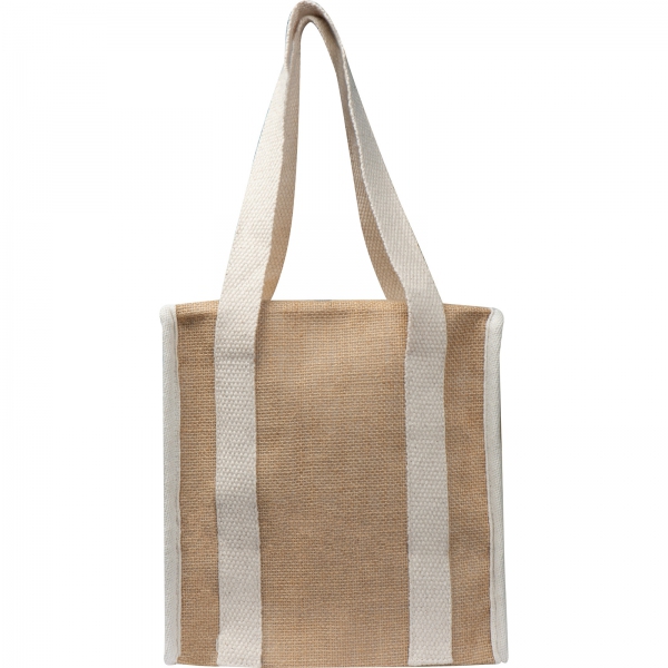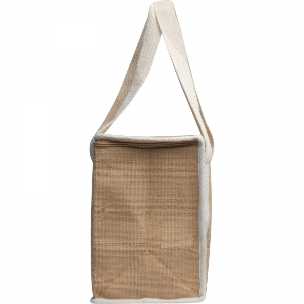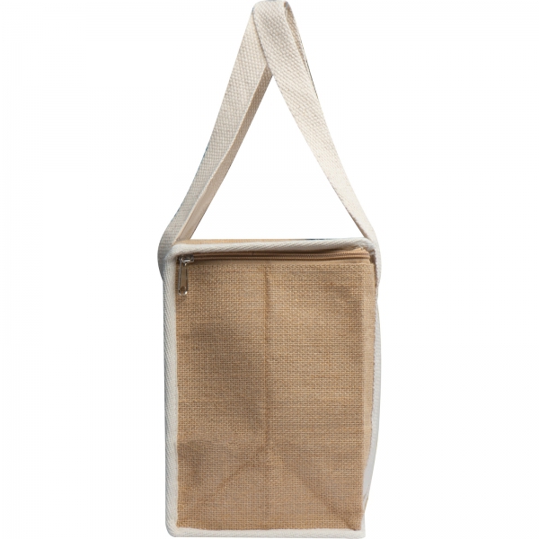 Torba chłodząca wykonana z odpornej na wilgoć, laminowanej juty. Wnętrze wyściełane termoizolującą pianką aluminiową. Torba zapinana na zamek, posiada dwa bawełniane uchwyty i bawełnianą kieszonkę z przodu. Pomieści 6 butelek 0,5l.