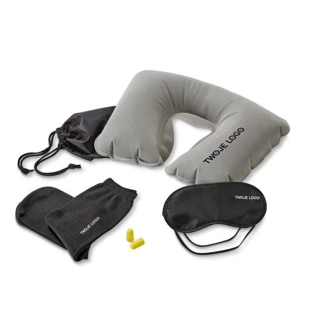 Zestaw podróżny z nadmuchiwaną poduszką na szyję, maseczką na oczy do spania, zatyczkami do uszu (nie stanowią osobistego wyposażenia ochronnego) i 1 parą skarpet. Dostarczany w etui 190T. Etui: 150 x 200 mm