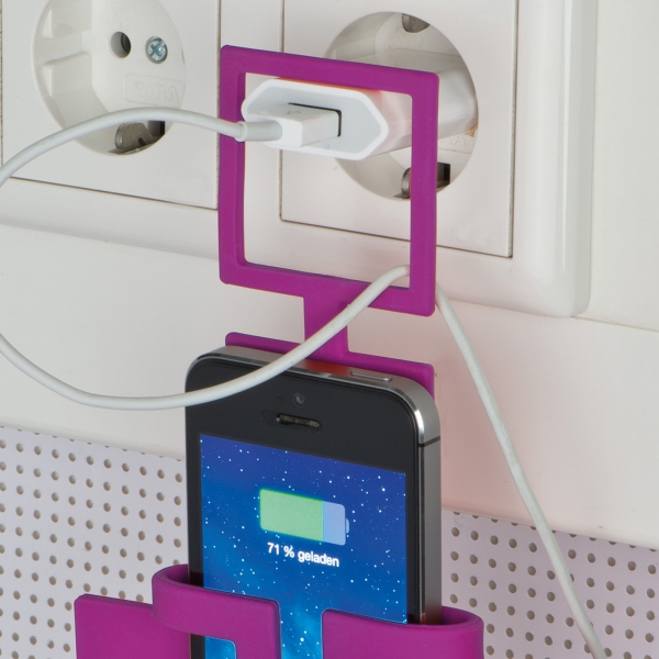 Uniwersalny, metalowy uchwyt na telefon, pokryty silikonem. Uchwyt można wykorzystać np. podczas ładowania telefonu.
