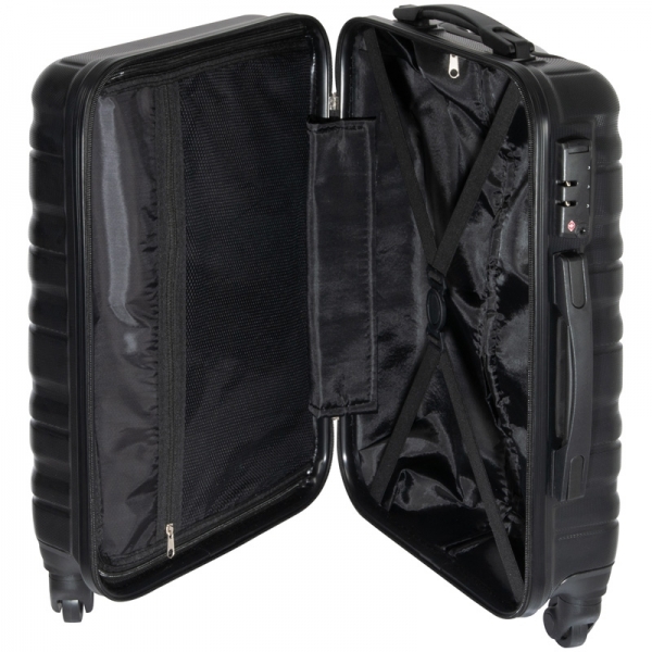 walizka typu trolley. Posiada 4 kółka i dużą komorę główną, kieszeń zamykaną na zamek błyskawiczny oraz teleskopowy uchwyt do prowadzenia. Dostępna w czarnym kolorze.