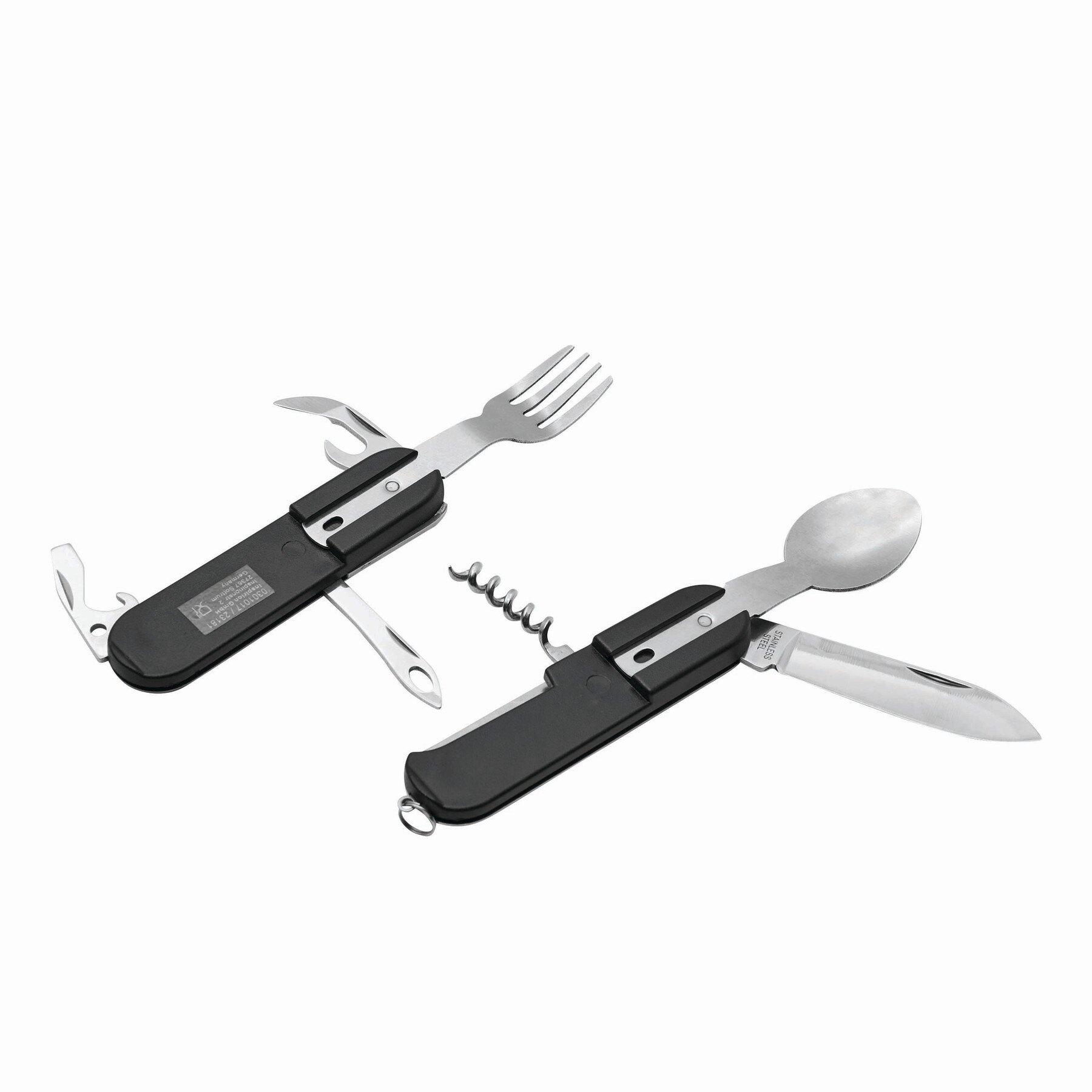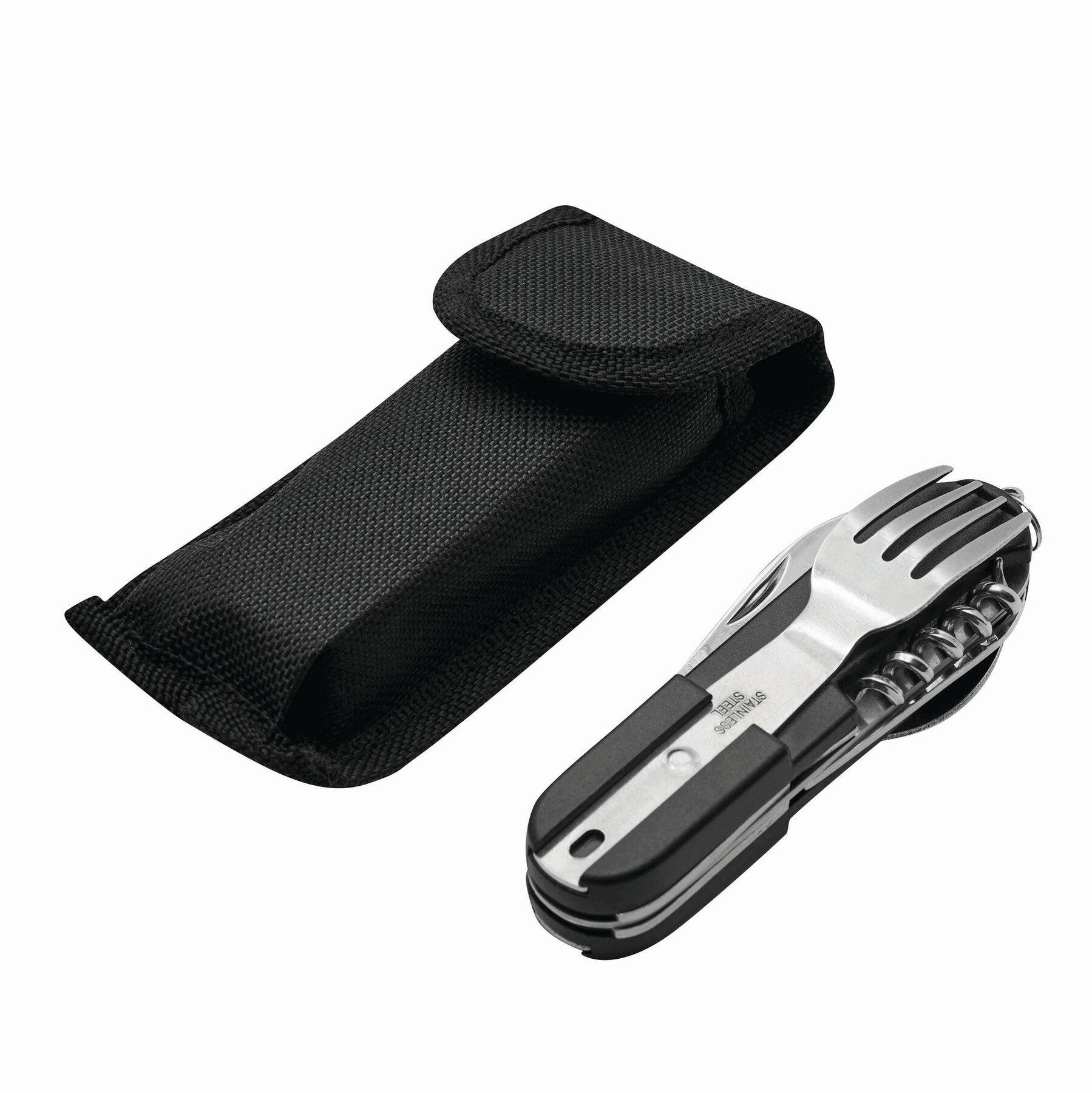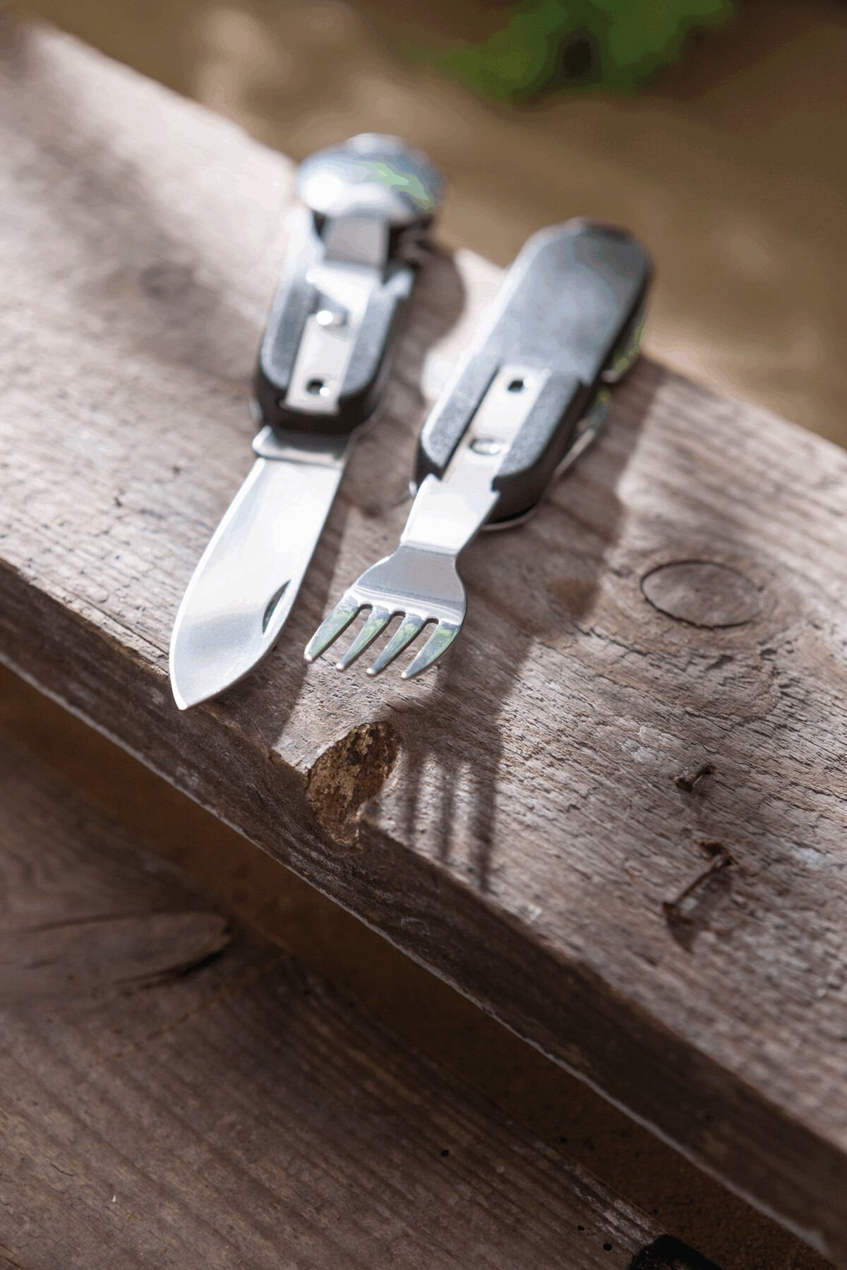 Wielofunkcyjny zestaw narzędzi WILDLIFE składający się z 7 elementów zrobionych ze stali nierdzewnej: składany nóż, otwieracz do butelek i puszek, korkociąg, składany widelec i łyżka, zawiera kółko do zawieszenia. W zamykanym na rzep pokrowcu z możliwością przypięcia do paska.