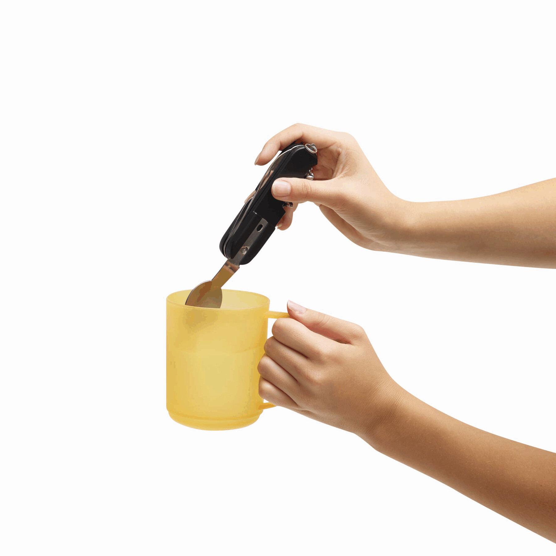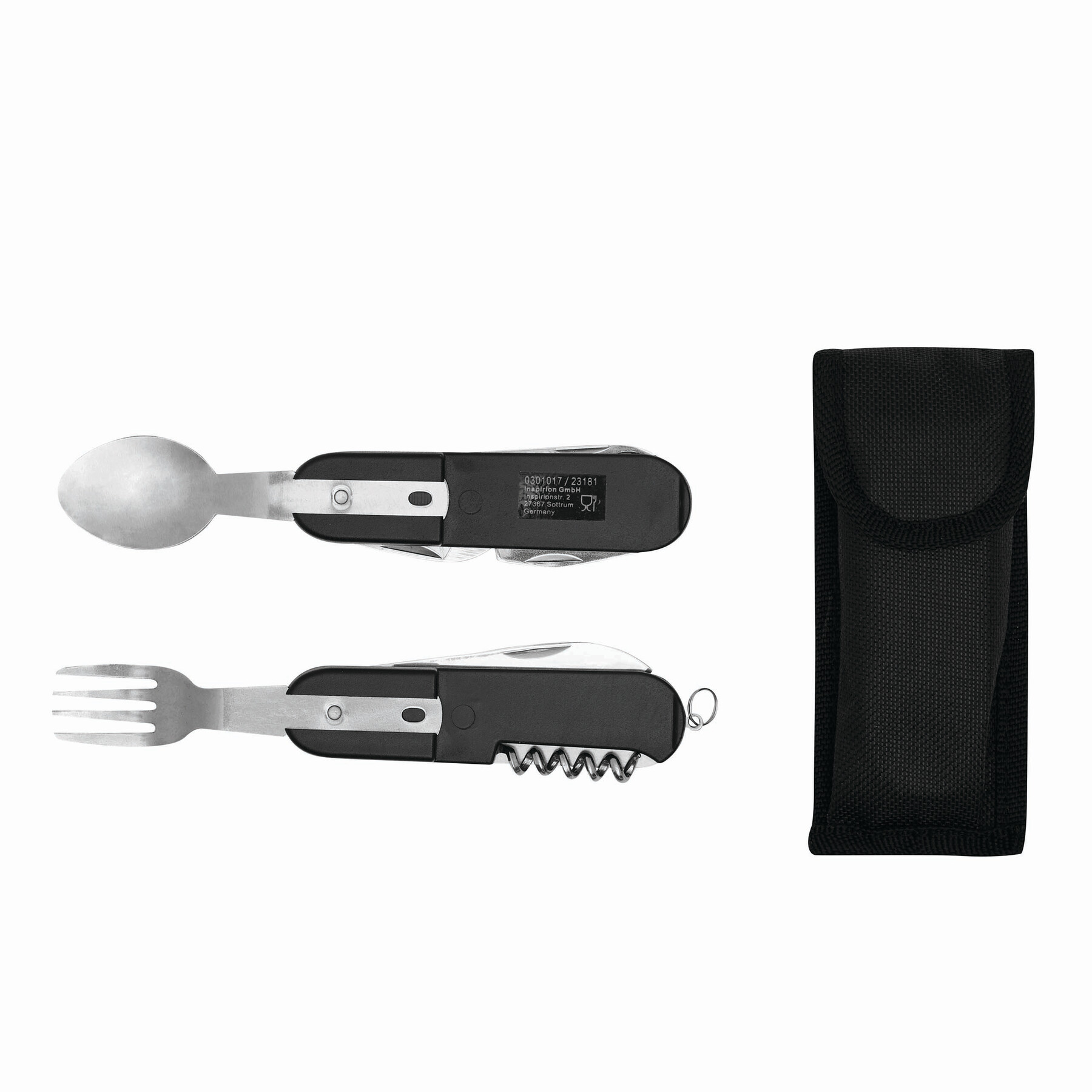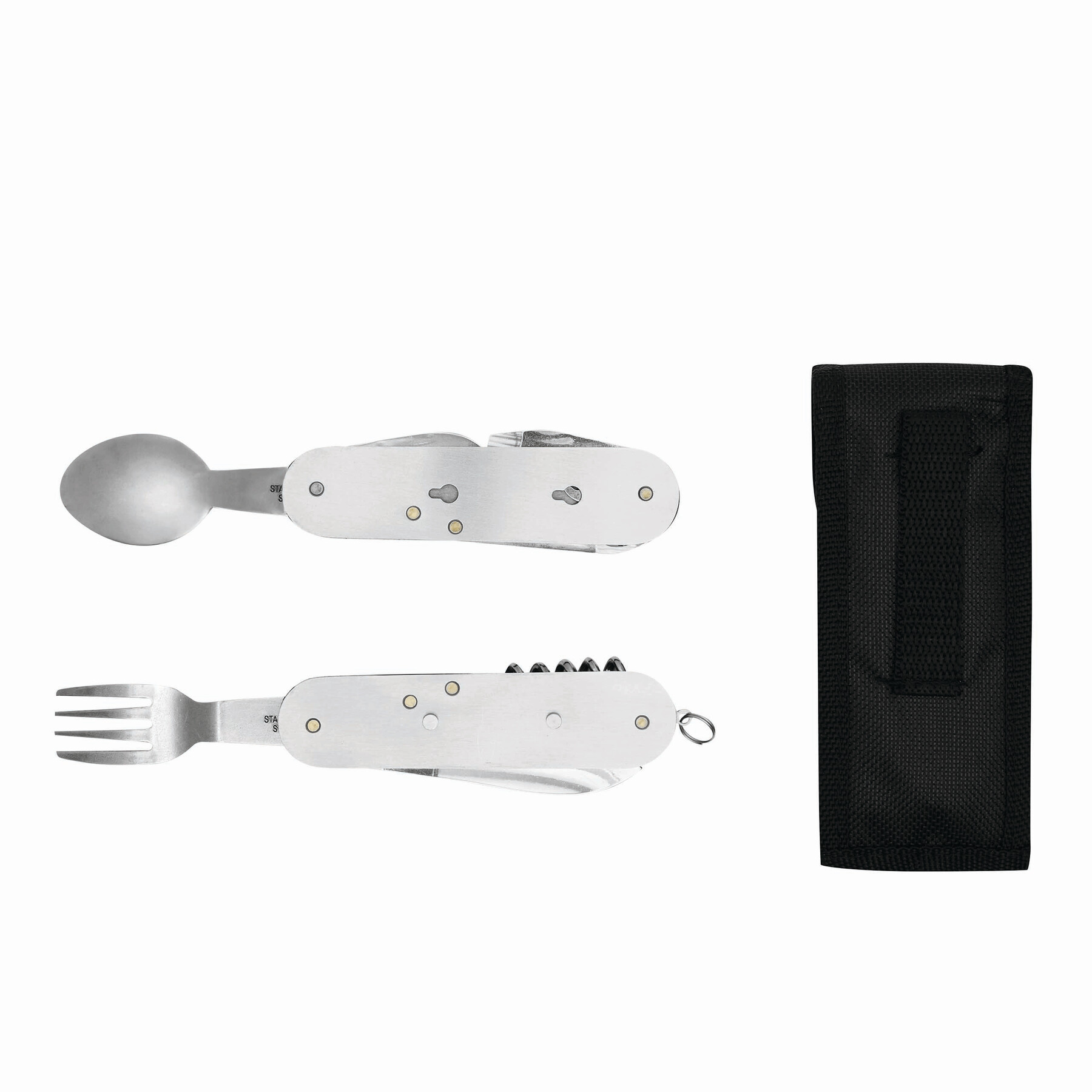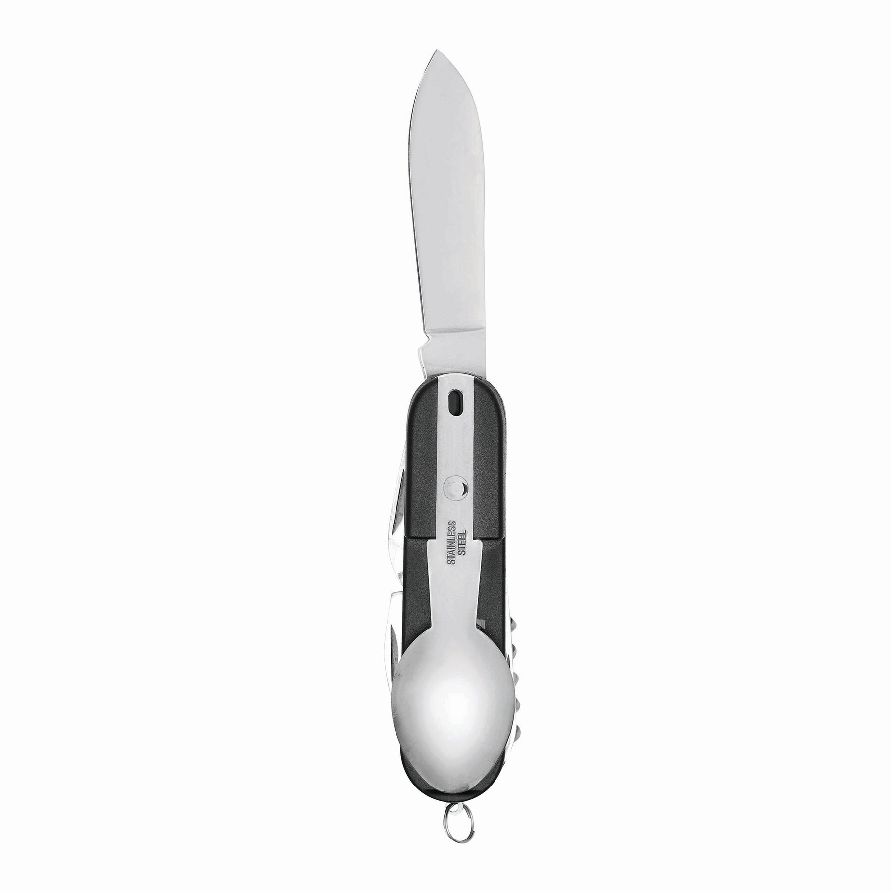 Wielofunkcyjny zestaw narzędzi WILDLIFE składający się z 7 elementów zrobionych ze stali nierdzewnej: składany nóż, otwieracz do butelek i puszek, korkociąg, składany widelec i łyżka, zawiera kółko do zawieszenia. W zamykanym na rzep pokrowcu z możliwością przypięcia do paska.