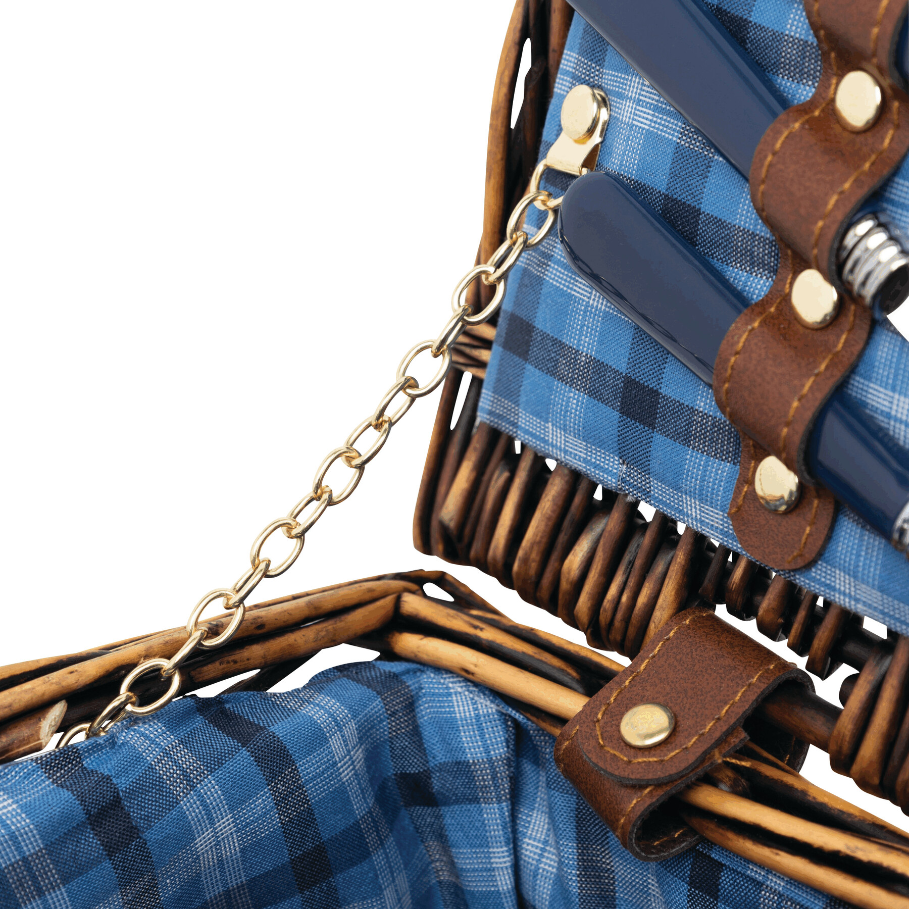Wiklinowy kosz piknikowy SUMMERTIME dla 4 osób z plastikowymi kieliszkami do szampana, ceramicznymi talerzami, widelcami, łyżkami i nożami, z rączką z boku, uchwytem, paskiem na ramię i zamkiem.