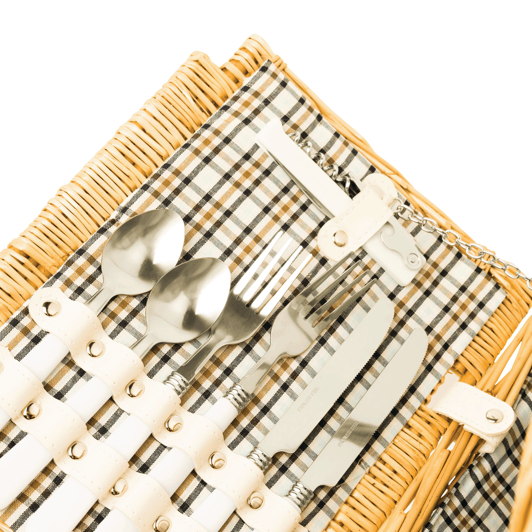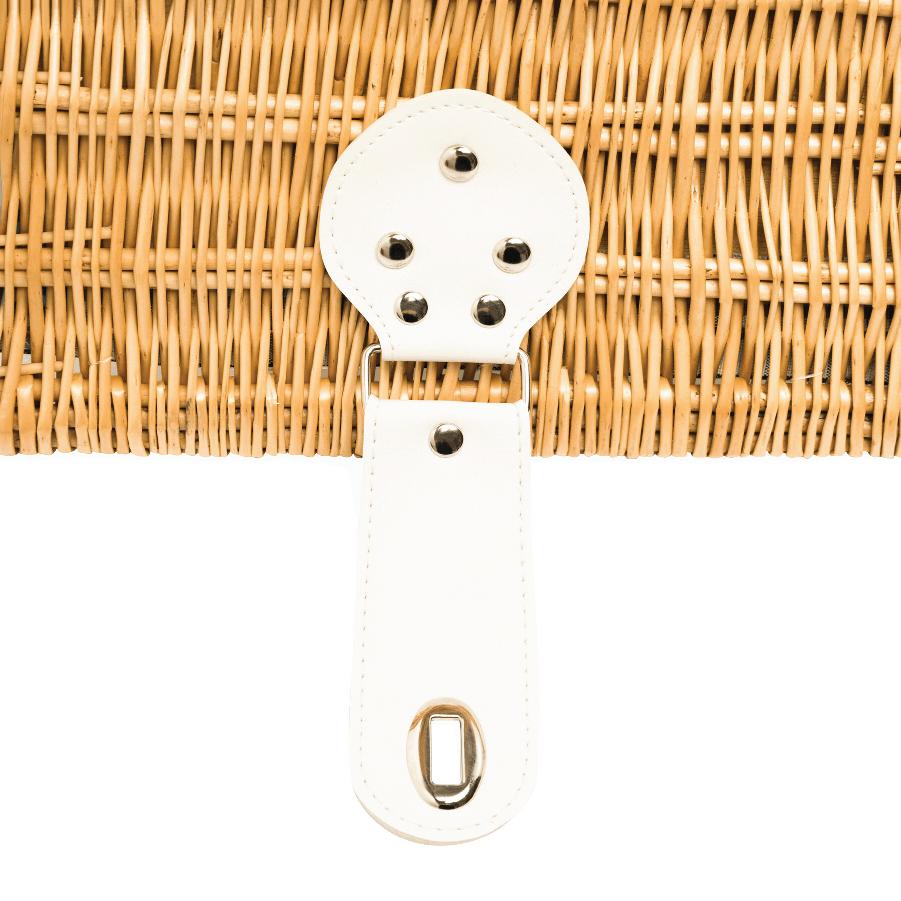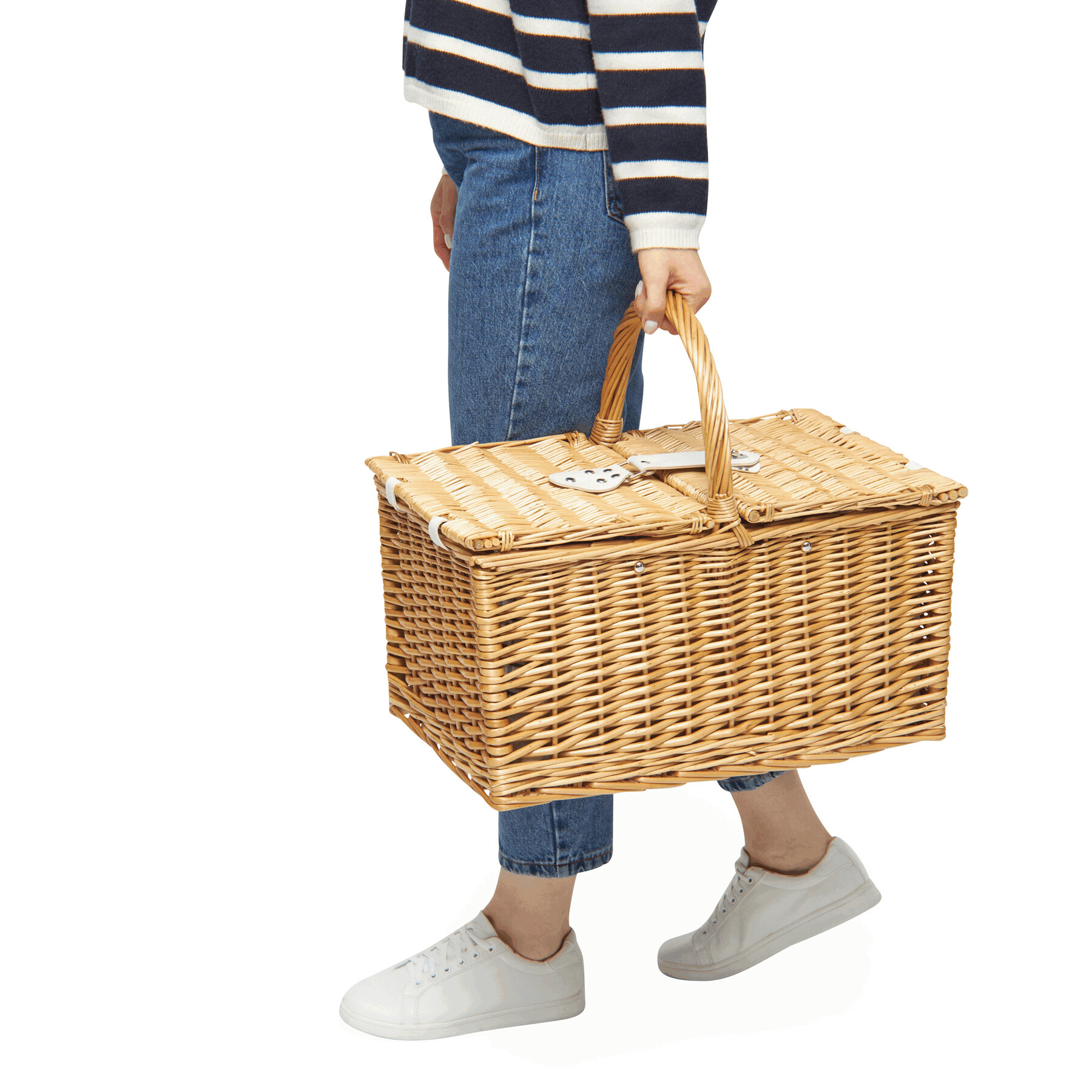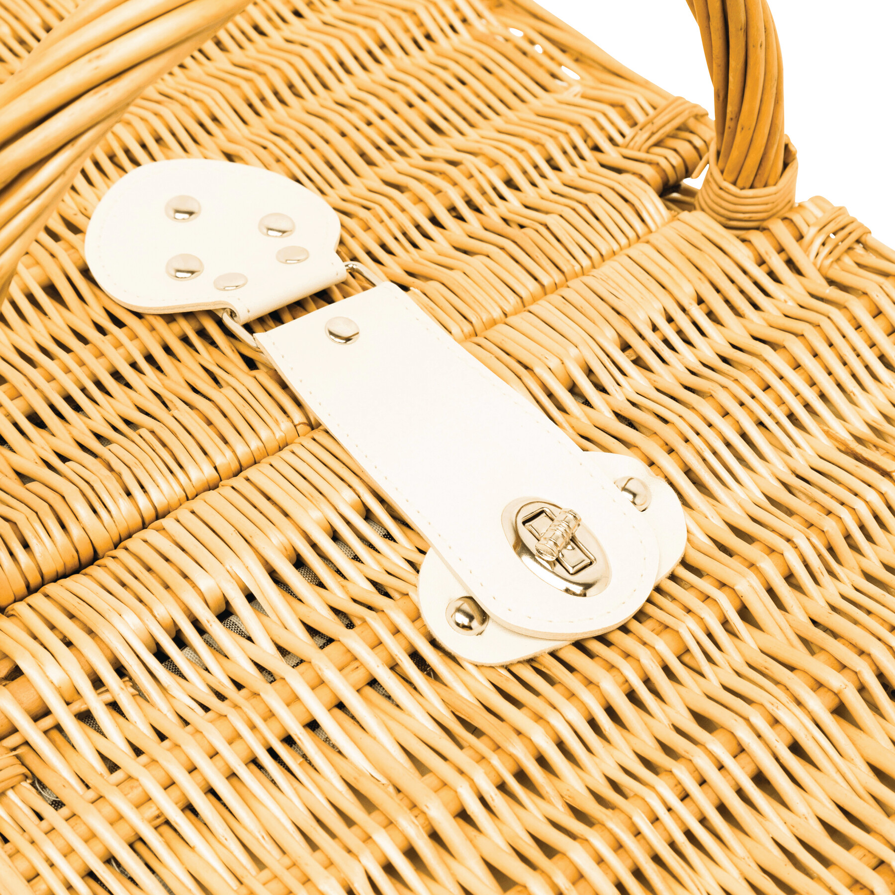 Wiklinowy koszyk piknikowy STANLEY PARK dla czterech osób. Zawiera sztućce ze stali nierdzewnej z plastikowymi rączkami, ceramiczne talerze, szklanki, serwetki oraz nóż kelnerski, z wewnętrznymi paskami mocującymi. Kosz z uchwytem i zamknięciem typu twist.