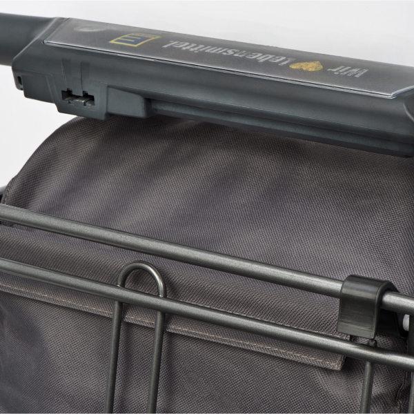 Składany wózek na zakupy uszyty z poliestru, z kieszenią termiczną. Rama wykonana z aluminium, posiada specjalny haczyk, dzięki któremu można go zawiesić na wózku sklepowym.