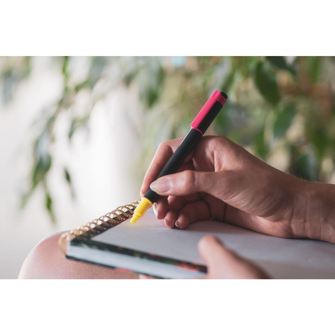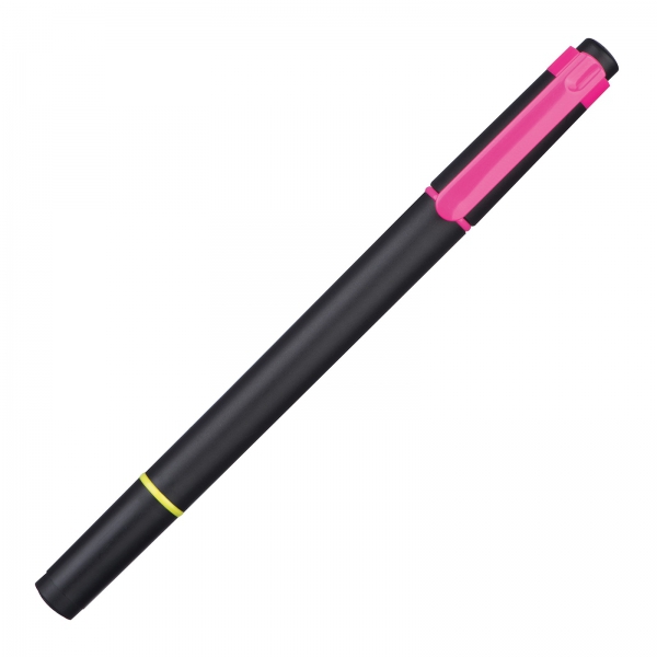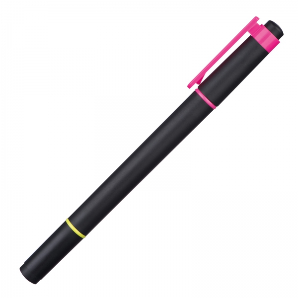 Plastikowy dwustronny zakreślacz w dwóch neonowych kolorach - różowym i żółtym.