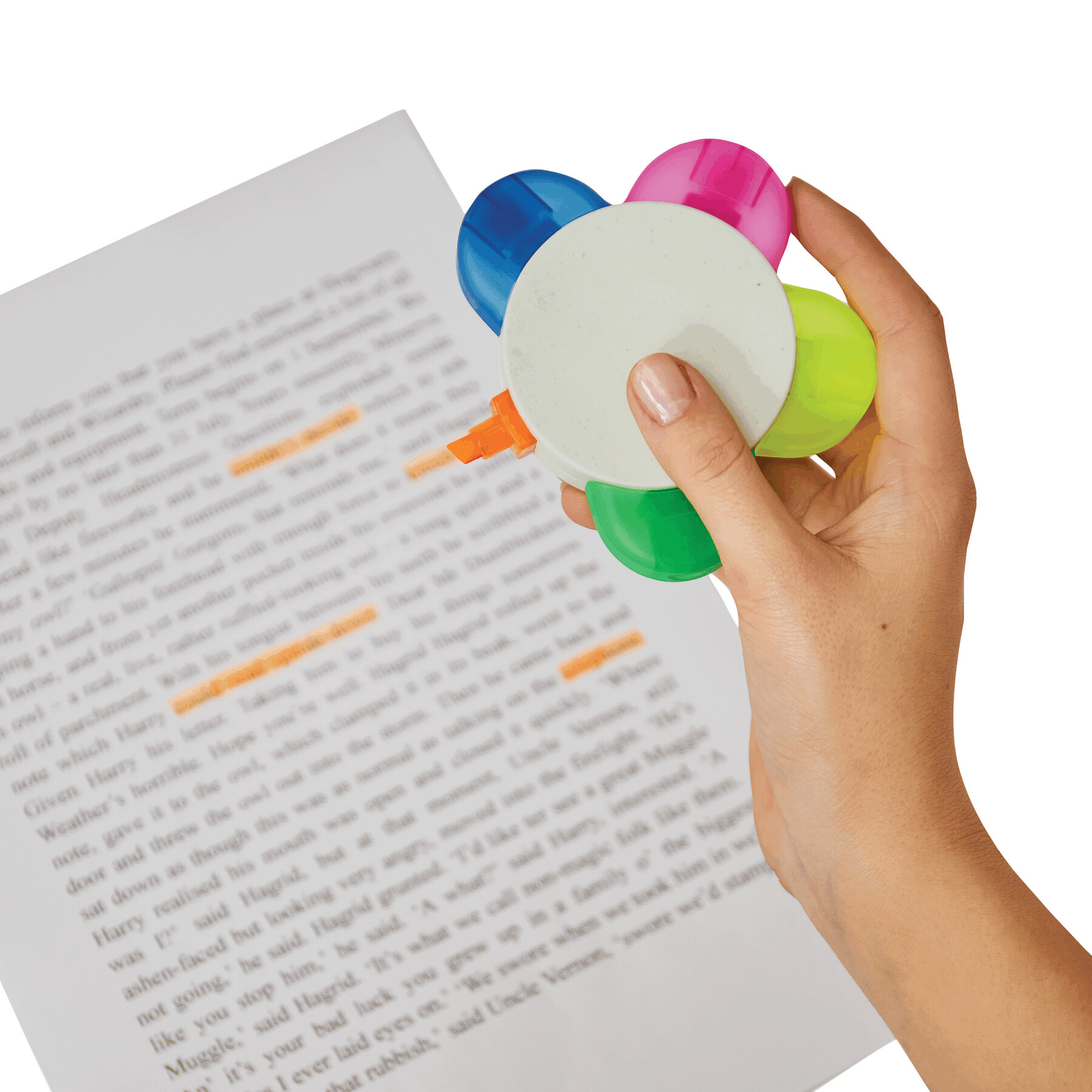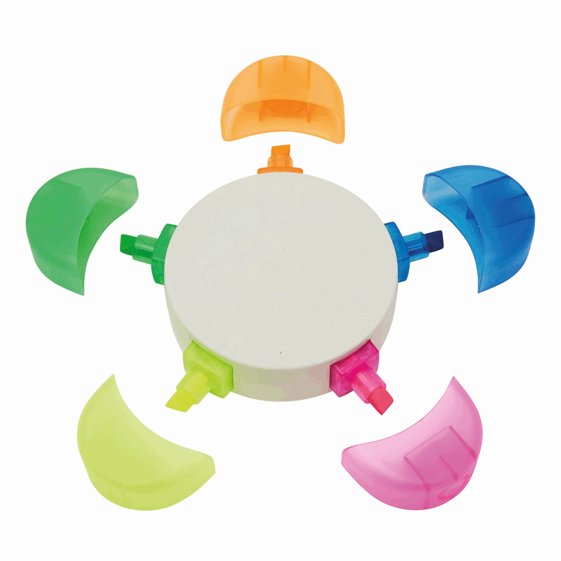 Zakreślacz w kształcie kwiatka FLOWER: w 5 kolorach (zielony, pomarańczowy, niebieski, różowy, żółty), wykonany w 30% z kartonów po mleku pochodzących z recyklingu.
