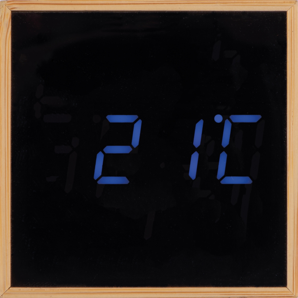 Elegancki zegar na biurko z drewnianą powłoką, czarnym wyświetlaczem i niebieskimi literami LED, pokazujący na zmianę godzinę, datę i temperaturę.
