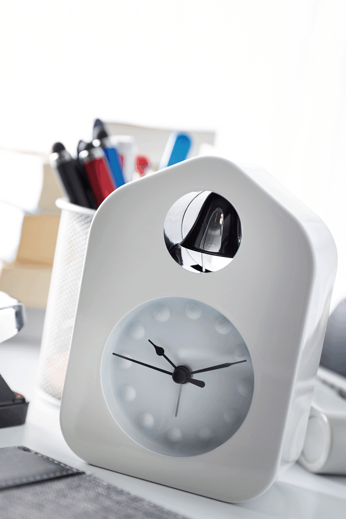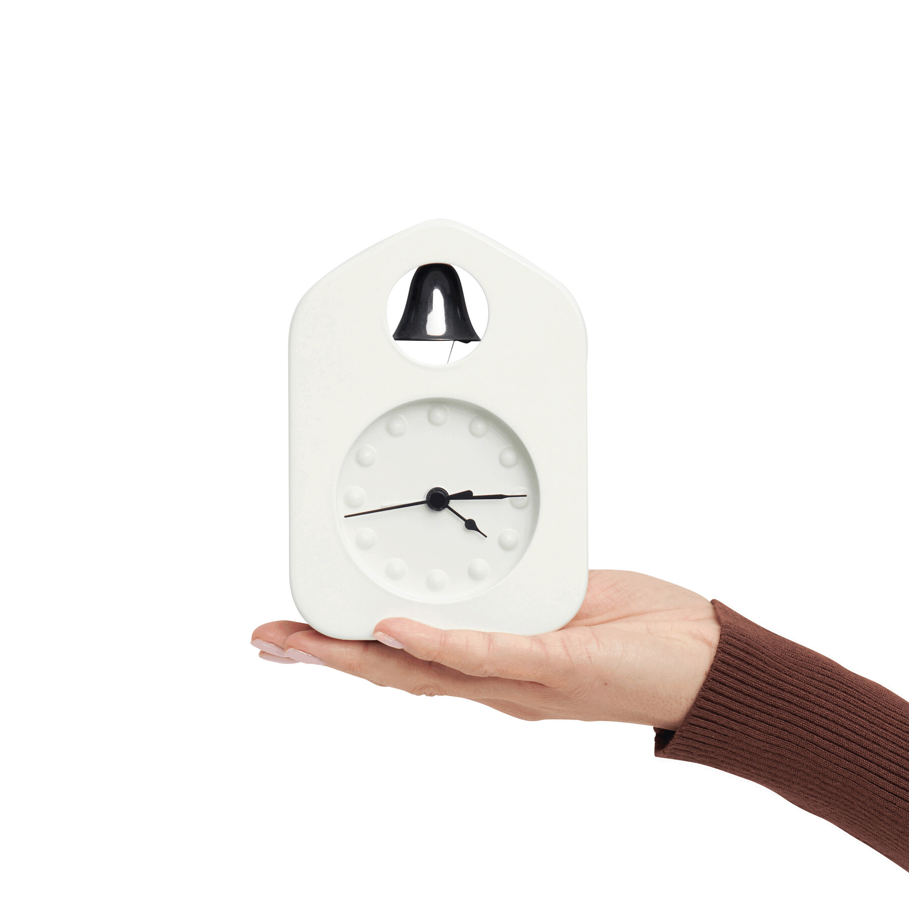 Zegar na biurko BELL w kształcie dzwonnicy. Biała tarcza z czarnymi wskazówkami Metalowy dzwoneczek pełni funkcję alarmu.