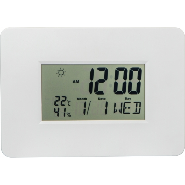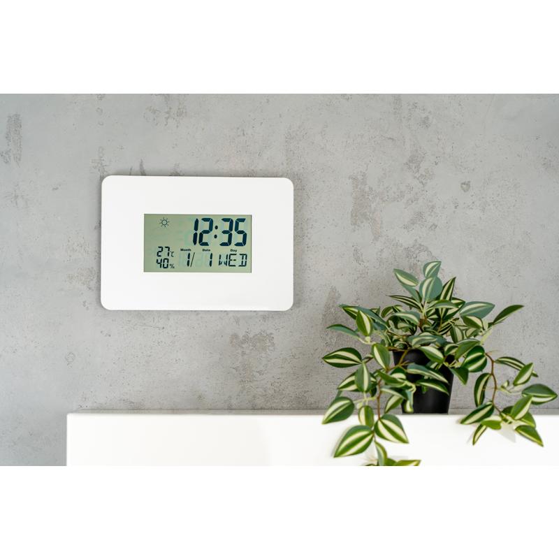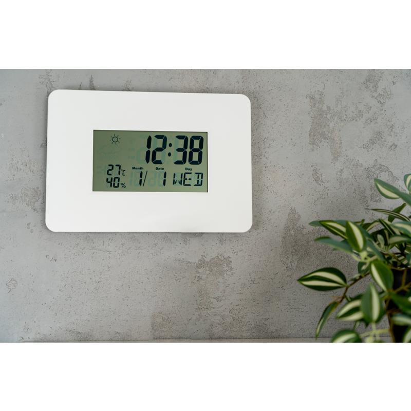 Cyfrowy zegar ścienny, wyświetlający datę, pogodę, temperaturę pokoju oraz poziom nawilżenia powietrza (wynik odświeżany co 20 sekund). Może służyć również jako budzik. Zegar nie zawiera baterii. Baterie 2xAAA możesz zamówić osobno, kod: 999400.