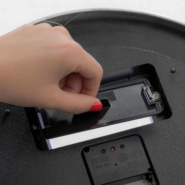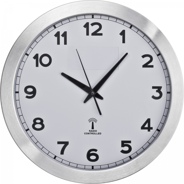Duży zegar ścienny z metalu i szkła, sterowany radiowo. Zegar automatycznie ustawia godzinę - wystarczy włożyć baterie i nacisnąć przycisk reset.