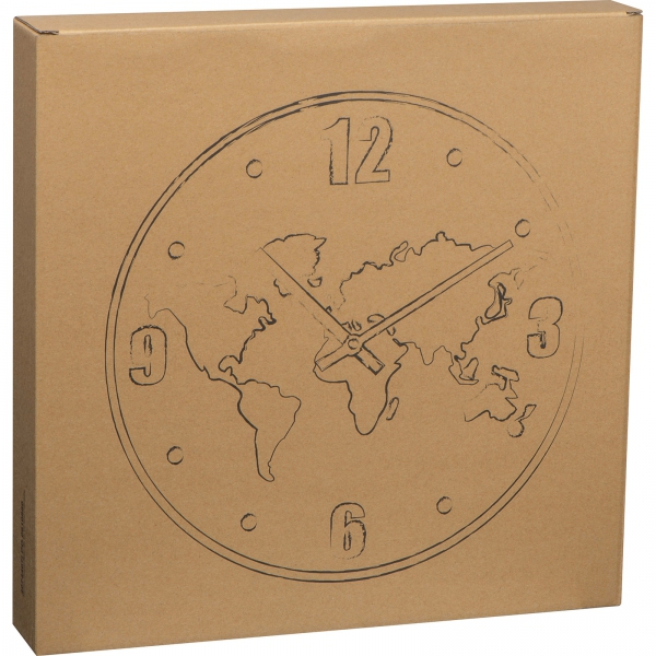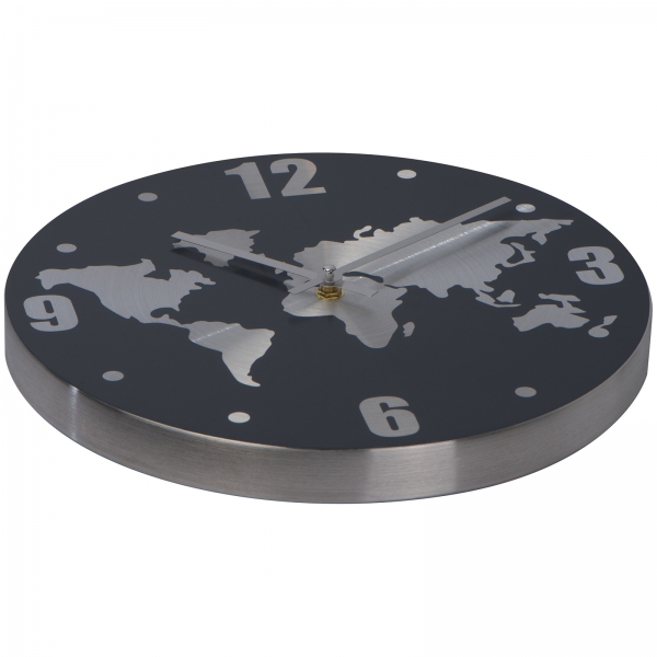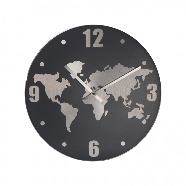 Zegar ścienny wykonany z aluminium z dekoracyjną mapą świata na tarczy.