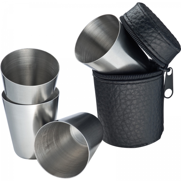 Zestaw 4 kieliszków ze stali nierdzewnej umieszczonych w etui z ekologicznej skóry. Pojemność 1 kieliszka: 30ml.
