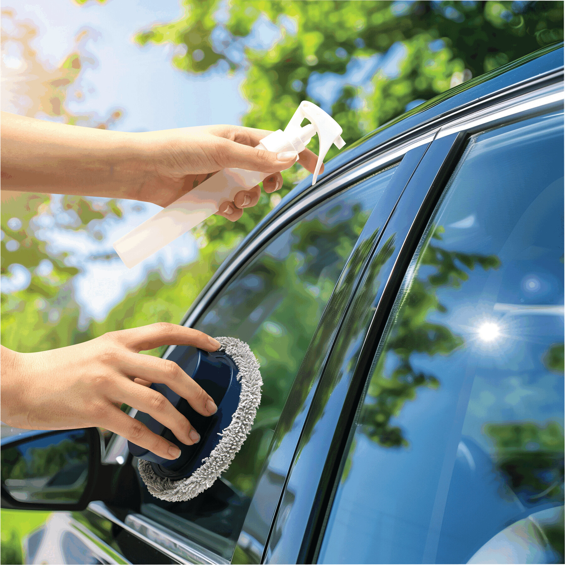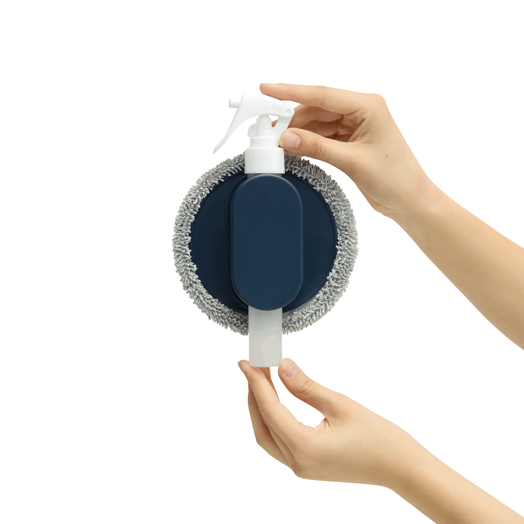 Zestaw czyszczący NO FLY. Składa się z butelki z pompką o pojemności ok. 40 ml oraz przymocowanej do niej za pomocą zapięcia na rzep okrągłej gąbki czyszczącej.